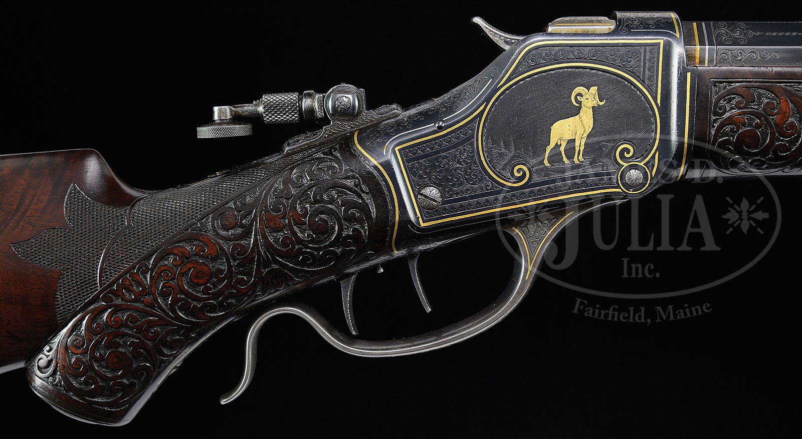 *EXTRAORDINARILY RARE & BEAUTIFUL DELUXE ENGRAVED WINCHESTER MODEL 1885 HI-WALL SINGLE SHOT RIFLE WITH EXTRA BARREL. SN 96428. Cal. 38-55 & 32-40. Spectacular hi-wall with 30″ No. 3 weight orig oct bbl with Rocky Mtn. front sight, flat top rear sight and locking Lyman tang sight with short base. Accompanied by a 30″ oct to rnd bbl with pedestal mounted Marbles #2 gold bead front sight and no rear seat. The half rnd bbl is mounted on the rifle and is marked on the top left flat over the chamber area “-A-O-ZISCHANG-SYRACUSE-N-Y-“. Right top flat is marked “-FLUID-STEEL-KRUPP-ESSEN-“. Mounted with spectacular 4X, center crotch, flame grain American walnut that is B-carved & checkered with black insert schnable tip forearm and capped pistol grip stock with crescent buttplate. Fitted with checkered Schuetzen dbl set triggers and a short Schuetzen finger lever. Receiver is extraordinarily engraved by one of the Ulrichs, probably John. The signature “ULRICH” appears between the set triggers without the initial “C” or “J” preceding. The engraving consists of the exceptional large vignettes of a flat gold walking bull moose in a very detailed woodland scene on the left side and a standing Big Horn ram in a detailed mountain scene on the right side. Both vignettes are surrounded by extremely fine foliate arabesque patterns with very fine shaded background and spade shaped borders. Both sides of the receiver are outlined in gold wire as are the vignettes. Top & bottom of the receiver, along with the front edge, are outlined in gold & platinum wire and have nearly full coverage matching engraving. Tang sight base & screws, along with the internal pivot, is engraved to match. Lever is also engraved to match with gold wire inlay. The area between the rear edge of the tang sight and the top tang screw is inlaid in platinum with the initials “WHC”, or a combination thereof. Buttplate tang is lightly engraved and has gold & platinum wire inlay. The Winchester bbl is engraved to match about 2″ over the chamber area and is inlaid with gold & platinum bands. Muzzle end of the bbl & around the front sight are engraved to match with a gold band. The Zischang bbl has the top flat of the oct section hand matted and the top center of the receiver is hand matted. Top edge of the breech block, top & rear edges of the hammer are also engraved. Accompanied by a Cody Firearms Museum letter which identifies this rifle in caliber 38-55 with 30″ No. 3 oct bbl, Schuetzen set trigger, fancy wood stock with pistol grip, palm rest, one Swiss plate to interchange (which apparently has been misplaced), Lyman rear cup disc and windgage, no rear seat, carved “B”, gold inlaid with vignettes #9 and #12, bbl inlaid at breech & muzzle, engraved $60.00, received in warehouse Oct. 30, 1903 and shipped next day to Order #207943, repair & return Oct. 9, 1913. This is truly one of the most elaborate & rare Winchester Hi-Wall rifles extant. CONDITION: Extremely fine plus. Orig bbl retains about 95% strong orig blue with light sharp edge wear and one small area of thinning about mid-point; it has brilliant shiny bore; the Zischang bbl retains about 99% crisp orig blue with faint sharp edge wear and one tiny thin spot near the muzzle and has brilliant shiny bore; receiver retains virtually all of its crisp orig blue with a couple of nicks on the gold animals; hammer & breech block retain strong orig case colors and the lever smoky case colors with brighter colors in sheltered areas; buttplate retains most of its orig blue with wear at the heel & toe. Wood is sound with a few minor nicks & scratches and retains virtually all of its orig hand rubbed oil finish. Mechanics are crisp. 4-48155 JR358 (150,000-250,000)