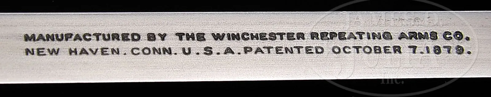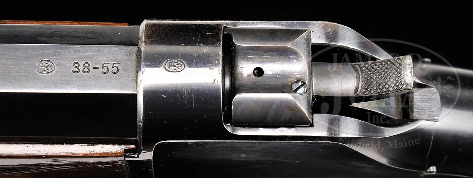 *SCARCE DELUXE WINCHESTER MODEL 1885 HIGH WALL SCHUETZEN SINGLE SHOT TARGET RIFLE. SN 105106. Cal. 38-55. Beautiful deluxe rifle with 30″ #4 weight oct bbl, spirit level windgage front sight, no rear seat and a mid-range vernier tang sight with 3″ staff. Receiver is fitted with Schuetzen dbl set triggers and a Schuetzen spur lever. Mounted with fancy flame & shell grain American walnut with H-style checkered, black insert, schnable tip forearm that has a factory palm rest base and an orig tuning fork palm rest. Buttstock has a capped checkered pistol grip with Schuetzen cheekpiece and perch belly with nickeled steel Helm Schuetzen buttplate. Left side of lower tang, under the wood, is marked with assembly number “3311”, “X” and “US”. Matching assembly number is also found on the rear face of the buttstock under the buttplate and inside the face of the buttplate. Accompanied by a Cody Firearms Museum letter which identifies this rifle in caliber 38-55 with 30″ #4 weight oct bbl, Schuetzen set triggers, checkered stock with pistol grip, Helm plate, palm rest, Schuetzen cheekpiece, spur lever and mid-range & windgage sights, no rear seat, received in warehouse May 23, 1907 and shipped June 11, 1907 to Order #102767. While Model 1885 High Wall rifles are not necessarily scarce, Schuetzen rifles are quite scarce and are very rarely found in completely factory orig configuration, especially with high orig finish. CONDITION: Extremely fine plus. Bbl retains 97-98% strong orig blue with only faint sharp edge wear; receiver retains 97-98% orig blue with some minor flaking on the right side and a lightly cleaned thin area on left side with a couple of minor scratches; breech block & hammer retain strong, bright case colors; lever retains strong case colors in the front web, turned silver on outer faces; buttplate retains virtually all of its orig nickel finish. Wood is sound with a few minor nicks & scratches and retains about all of an extraordinary professionally restored finish. Mechanics are crisp, brilliant shiny bore. 4-47727 JR265 (10,000-15,000)