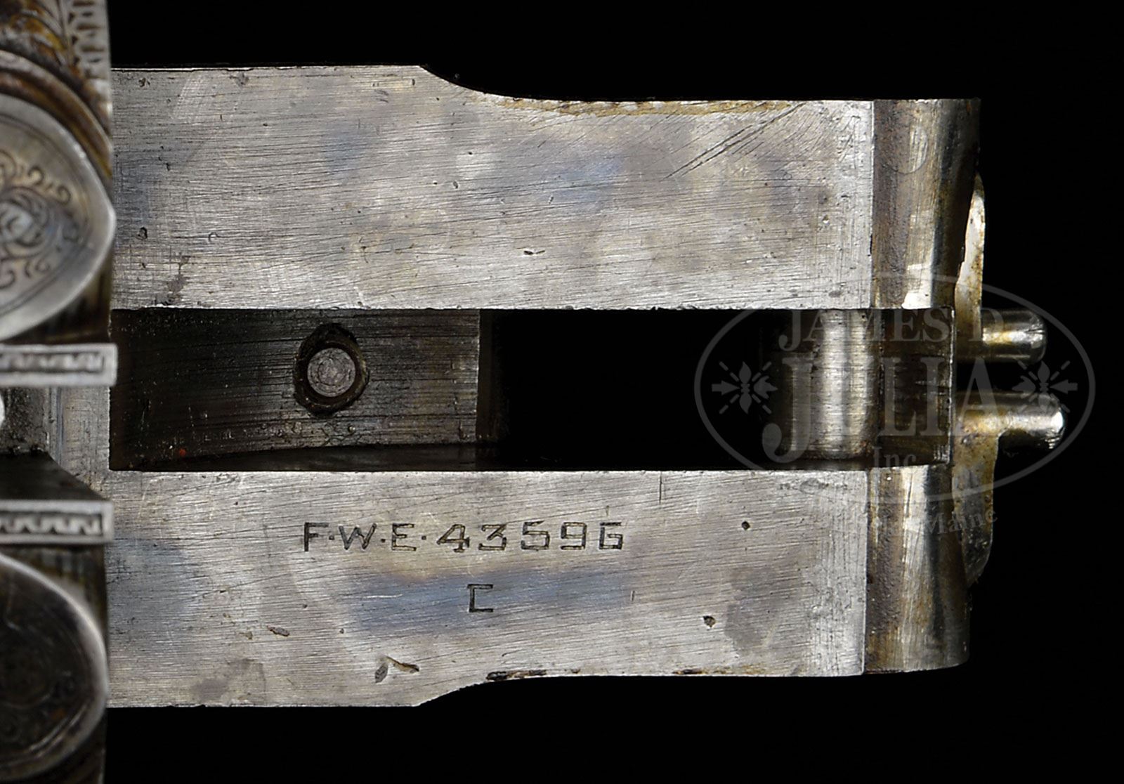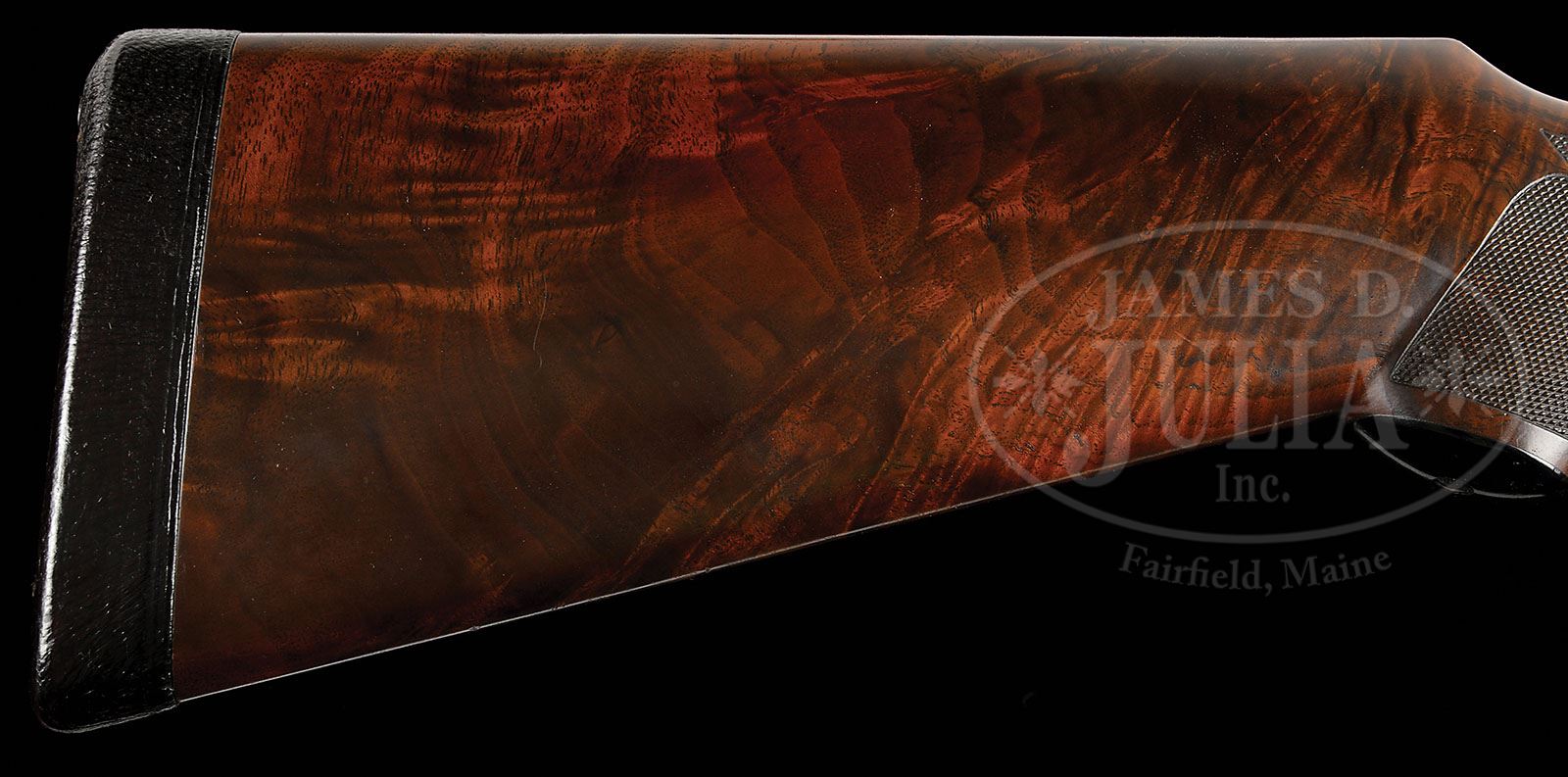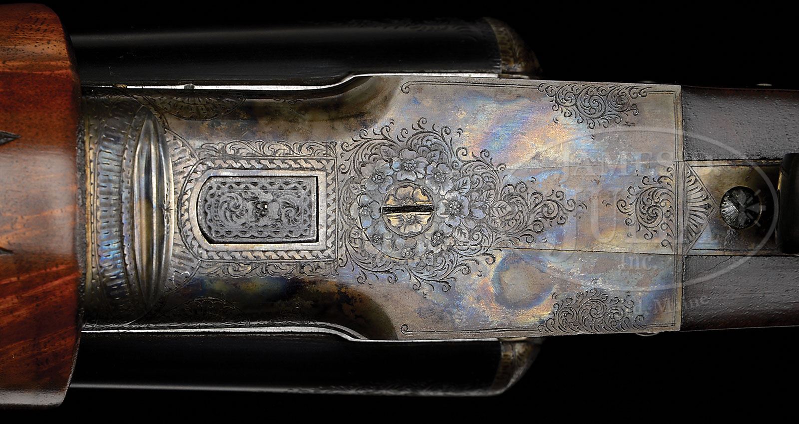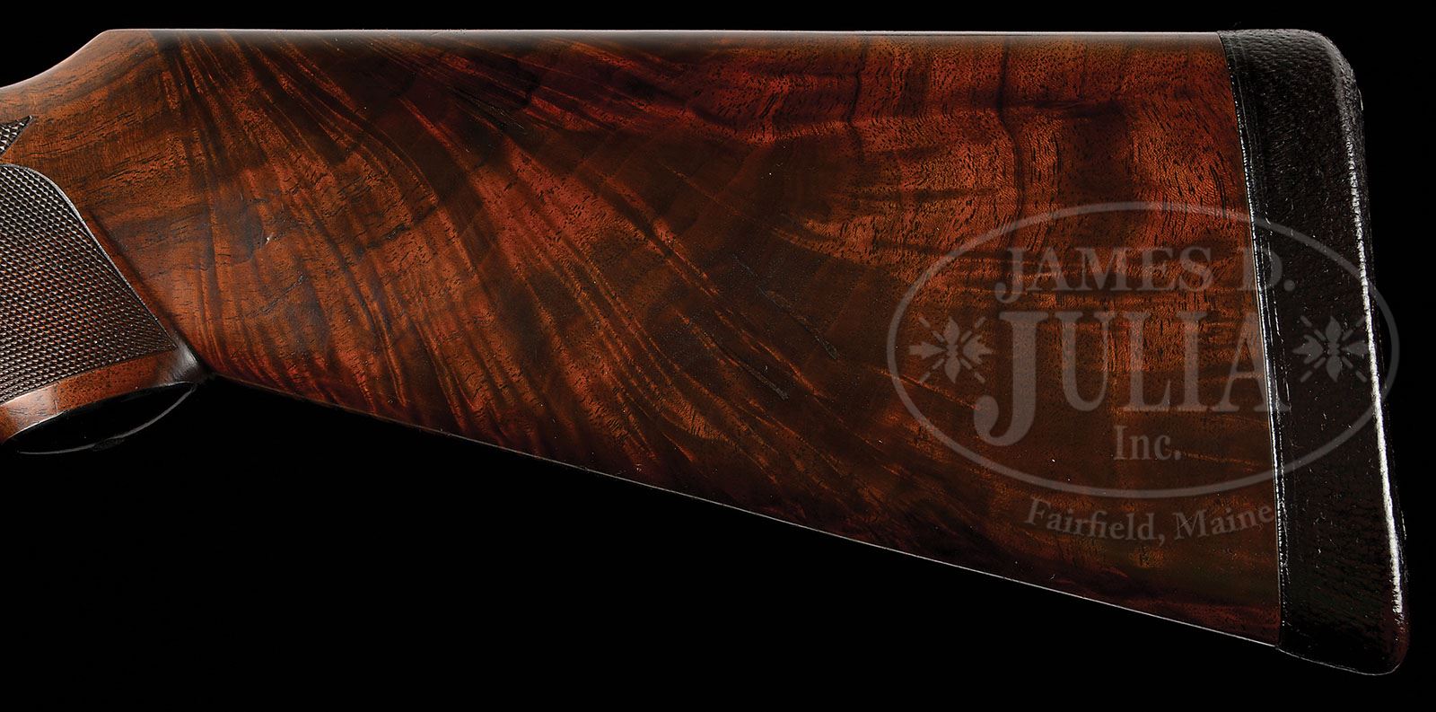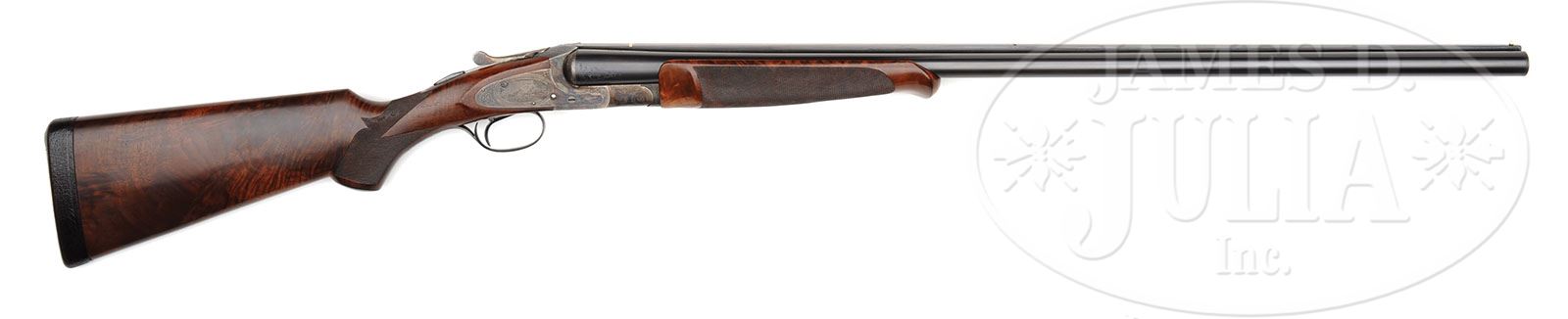 *LATE PRODUCTION L. C. SMITH CROWN GRADE WITH SINGLE TRIGGER AND BEAVERTAIL FOREND. SN FWE43596. (1950) Cal. 12 ga. 2-3/4″ Chambers. 30″ Bbls with high, single sighting plane, matted rib fitted with two ivory beads, are engraved “L. C. SMITH Crown GRADE” and “L. C. Smith Gun Co. Inc. Fulton. N. Y” on tops.There are 1-1/2″ triangles of scroll at breech ends, and geometric bands at muzzles. Engine turned bbl flats are engraved with SN, “C”, and Hunter proofs. Bottoms of bbls are stamped with Nitro Steel logos. Case hardened featherweight action is engraved with SN and “C” on water table. There are nicely filed beads around fences, and action is fitted with Hunter selective “One Trigger”. Action is engraved with 60% coverage small scroll with floral highlights within geometric borders. Lockplates with “L. C. Smith” at fronts, also have scroll engraving with floral accents surrounding oval vignettes of engraved and etched gun dogs in appropriate settings; a pair of setters on point on left lock, and pointers on right. A gold crown is inlaid on top lever. Steel trigger guard is engraved with roses on bow and has SN at grip. Boldly feather crotch figured, dense American walnut capped pistol grip buttstock measures 14-1/4″ over dark brown leather covered pad. Wraparound grip checkering is of point pattern with small flourish at rear. Large, schnabeled, beavertail, ejector forend has oval secondary latch escutcheon. Bore diameter: left-.727, right -.727. Bore restrictions: left -.032 (Full), right -.019 (Mod). Wall thickness: left -.032, right -.032. Drop at heel: 2-7/16″, drop at comb: 1-7/16″. Weight: 7 lbs. 14 oz. LOP: 14-1/4″. PROVENANCE: Hunter Arms Co letter with specifications for this gun, that it was finished Mar 9, 1950, and that only 11 other Crown grades had identical features to this gun. CONDITION: Excellent. Bbls retain 95% + what appears to be orig blue, although engraving is slightly softened. Action retains approx 90% orig case hardening color, silvered slightly on sharp edges, fences, and considerably on top. Lockplates retain most of their orig color hardening, thinned toward back. Stocks retain nearly all of what appears to be their orig oil finish, grain slightly open and raised, with a few light scratches and minor marks. Checkering is slightly worn and darkened. Leather covered pad is new. Bores are excellent. Action is tight. Trigger works in right/ left position, but will not select due to congealed oil. Ejectors are slightly out of time. Recent research finds that a total of 827 Crown grades were produced, 204 were in 12 ga. with 30″ bbls. 4-49269 MGM137 (7,500-12,500)