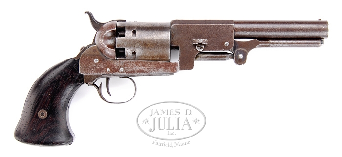 UNUSUAL UNMARKED EARLY PERCUSSION REVOLVER SN NSN. Cal. About 36. Made by an unknown maker with 5-1/8” oct to rnd bbl resembling a small dragoon bbl with deep 7-groove, straight rifling. It has a 2-pc Colt style rammer with an unusual bayonet type latch & stud just below muzzle. Wedge enters from right side with screw below. It has a 6-shot straight cylinder with deep protected nipple wells and rnd cylinder stop slots with short leads. Frame is flat sided with heavy recoil shields having a sgl bbl/frame pin and hammer with a long spur & a curl at end. Trigger guard base & front strap are 1-pc held with three screws and trigger guard is stamped metal screwed to bottom. It has a hump-back 1-pc back strap & butt strap screwed to back of frame and joined at front strap. It has a hump-back 2-pc smooth dark walnut grip with flared butt. CONDITION: Good. Bbl & rammer retain an overall smooth plum brown patina with a few light nicks & dings on bbl lug. Cylinder is a thin gray/brown patina with one small area of dings. Trigger guard & grip frame retain dark blue finish with fine surface rust. Receiver retains traces of blue in sheltered areas with balance a silver/brown patina with light surface pitting. Mechanics are fine, strong sharp bore, dark in grooves. 4-32681 JR497 (1,000-2,000)