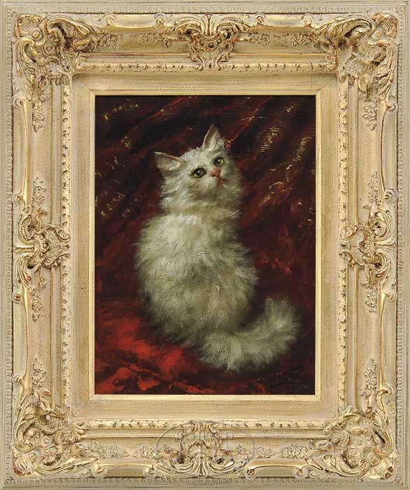CARL KAHLER (American/Austrian 1855-1906) WHITE KITTEN. Oil on canvas portrait of a white kitten against a red curtain background. Signed lower right, dated “95”, and inscribed “New York”. Housed in a modern decorative frame. SIZE: 16″ x 12″. CONDITION: Very good. 9-26161 (2,000-3,000)