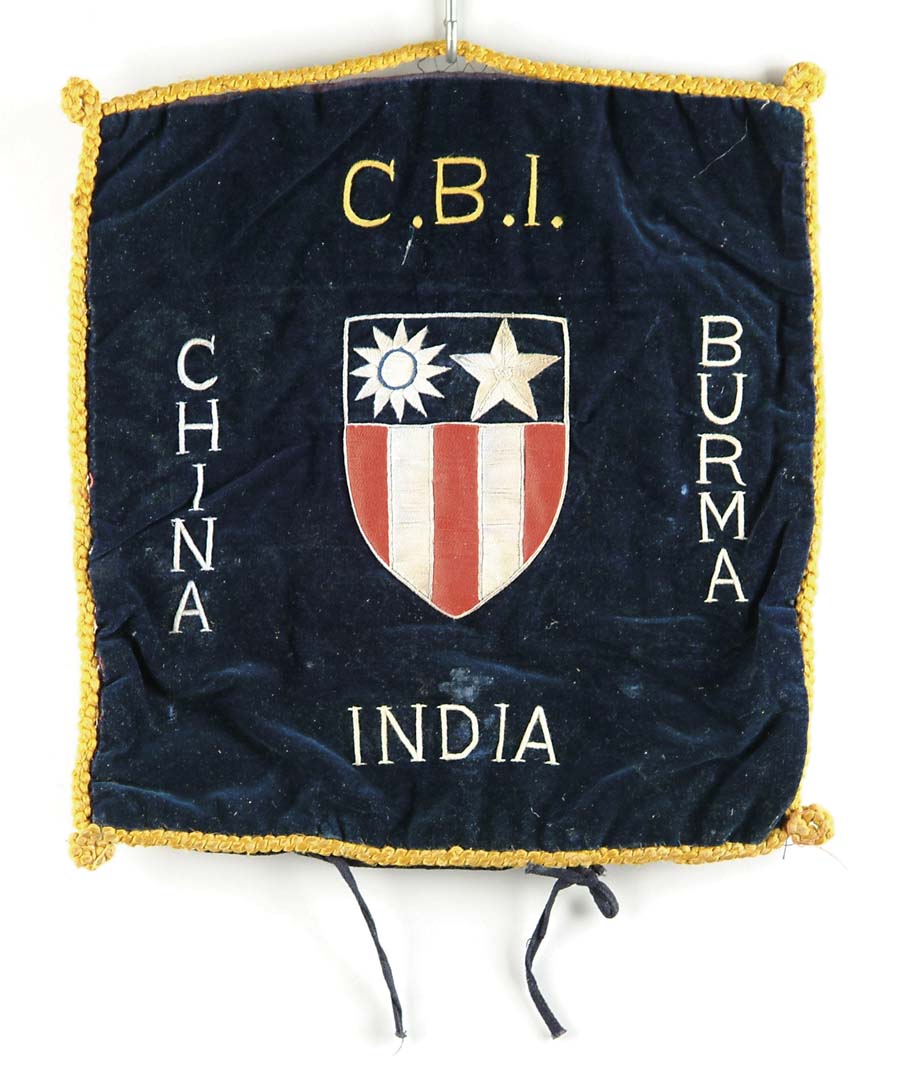 C.B.I. BANNER. 16” x 16”, blue background with gold braid edging. With the China/Burma/India shield and names. Mounted on Masonite. CONDITION: Slightly dirty but still solid. 4-54157 FS327 (100-200)