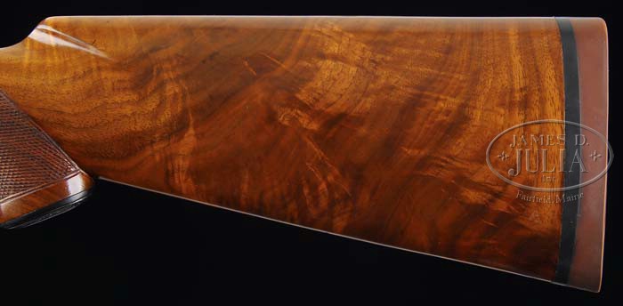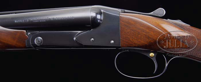 *WINCHESTER MODEL 21 FACTORY VENT RIB TRAP GRADE SIDE BY SIDE. SN 25749. Cal. 12 ga. 30″ bbl, matted tapered vent rib with dual silver sighting beads, 2-3/4″ chambers, choke marked FULL/FULL, ejectors, and single selective trigger. Left bbl is marked on side “MODEL 21-WINCHESTER/TRADE MARK-12 GAUGE 2-3/4”. Standard step side receiver with trigger plate stamped “TRAP” over screw. Mounted with nicely figured walnut, checkered beavertail forend, checkered pistol grip with Winchester hard rubber grip cap, and solid red recoil pad marked “WINCHESTER”. Bore diameter: left -.727, right -.727. Bore restrictions: left -.030, right -.033. Wall thickness: left -.039, right -.038. Drop at heel: 2″, drop at comb: 1-3/8″. Weight: 8lbs. LOP 14-1/4″. CONDITION: Extremely fine. Bbls retain 97-98% orig blue with some minor small handling marks and rub mark on bottom from forend. Receiver retains 97-98% factory restored blue with some minor sharp edgewear and some tiny flaking spots on trigger plate. Wood is solid with sharp checkering a few minor handling marks and retains virtually all of a factory restored finish. Forend is sound with good checkering, a few minor handling marks and retains nearly all of its factory restored finish. Mechanics are crisp with non-auto safety and bright shiny bores. 4-37452 BDT158 (6,000-8,000)