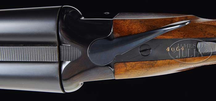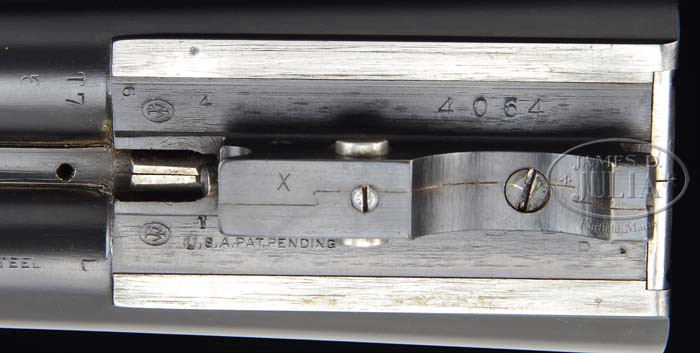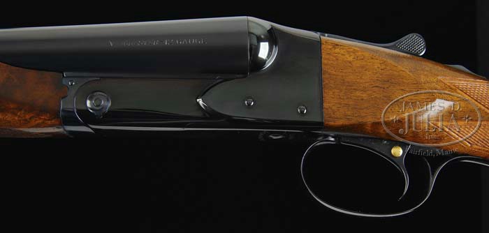 *EXTREMELY FINE WINCHESTER MODEL 21 TOURNAMENT SKEET GRADE WITH CASE. SN 4064. Cal. 12 ga. 26″ bbl with tapered, matted, concave rib, red Bradley front and silver center sighting beads, ejectors, WS1 & 2 marked chokes, single selective trigger. Usual Model 21 rcvr with floor plate stamped “Tournament” over screw and “Skeet” under. Mounted with nicely figured walnut, checkered beavertail forend, checkered pistol grip with steel, sculpted grip cap and checkered butt. Bore diameter: left -.731, right -.731. Bore restrictions: left -.010, right -(.016). Wall thickness: left -.031, right -.023. Drop at heel: 2-1/2″, drop at comb:1-1/2″ . Weight:7lbs7oz. Length of pull:14″. Accompanied by brown, leather luggage case with red, felt lining, maker’s label inside lid and access. incl. new hanging tag. CONDITION: Extremely fine. Bbl retains nearly all of a fine orig quality blue, with just a few very minor, light handling marks. Rcvr, likewise, retains nearly all the fine factory quality blue with sharp, crisp lines. The factory replacement stock is sound with sharp, crisp checkering, a few minor handling marks and retains virtually all of its fine orig finish. Forend is sound with good checkering, some minor handling marks and scratches and retains most of its orig finish, blending with some hand worn patina across bottom. Mechanics are crisp with non-auto safety, strong ejectors and nice shiny bores. 4-36278 BDT35 (7,000-10,000)