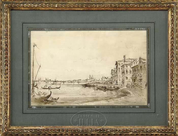 GIACOMO GUARDI (Italian, 1764-1835) VIEW OF VENICE. Pen and gray wash coastal view shows several gondolas on water leading to houses and buildings on shoreline. Unsigned, having an old typed label on reverse. Housed in a decorated wood frame with fancy blue matte. SIZE: Sight: 8-1/4″ x 13″. CONDITION: Very good. 9-20178 (1,200-1,500)