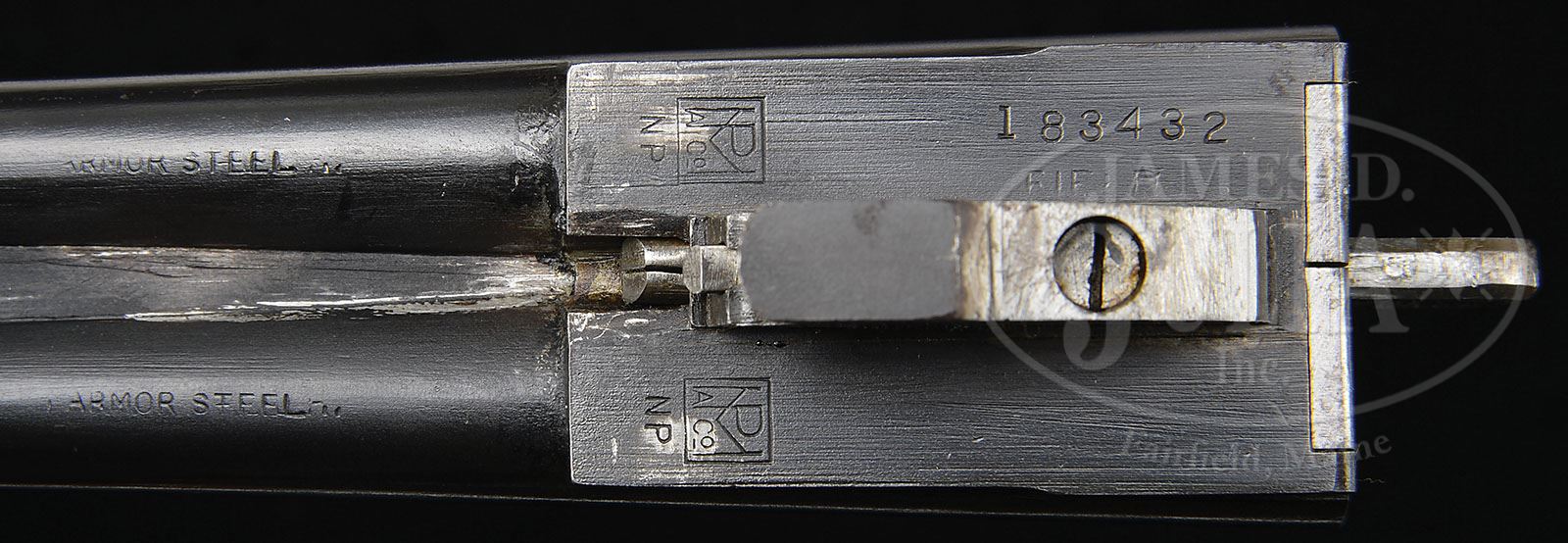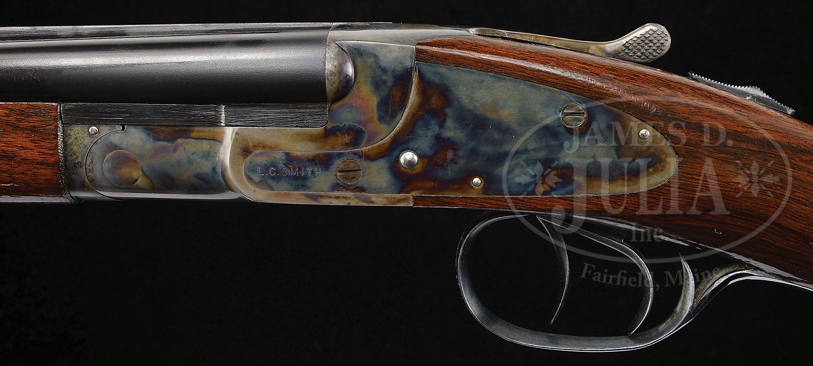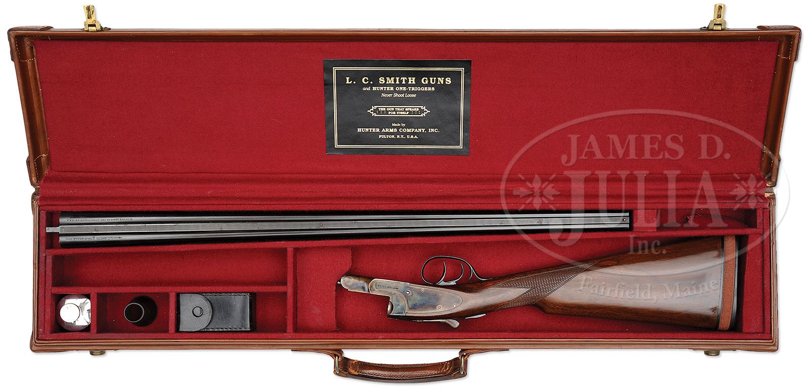 *EXCEPTIONALLY RARE, HIGH CONDITION, CONSECUTIVE PAIR OF L. C. SMITH FIELD GRADE .410S, ONE WITH EJECTORS AND CASE. SN FW183432/ FW183433. Cal. .410. 3″ Chambers. No.183432 has 26″ bbls and automatic ejectors. No. 183433 has 28″ bbls and plain extractors. Both have high, matted, single plane ribs mounted with two bronze beads. Breech ends have typical L. C. Smith Field grade markings and Hunter Arms address. Bbl flats are stamped with SNs, grade, and Hunter proofs. Bottoms of bbls are stamped “Armor Steel”. Typical case hardened actions are correctly marked on water tables, and feature automatic safeties and double triggers. No. 183432 has American walnut straight grip stock with leather faced foam recoil pad. No. 183433 has American walnut capped pistol grip stock with hard rubber buttplate. Both have splinter forends. No. 183432 has ejectors and oval secondary latch. 26″ Bbls on 183432: Bore diameter at muzzles: left-.386, right -.393. Wall thickness: left -.028, right -.026. Drop at heel: 2-1/8″, drop at comb: 1-7/16″. Weight: 5 lbs. 12 oz. LOP: 13-1/2″. 28″ Bbls no. 183433: Bore diameter at muzzles: left-.379, right -.379. Wall thickness: left -.029, right -.030. Drop at heel: 2-1/2″, drop at comb: 1-9/16″. Weight: 6 lbs. 1/2 oz. LOP: 14-1/8″. Gun no. 183432 comes with Abercrombie & Fitch marked VC leather case with stitched leather corners, which is lined in burgundy cloth. There is a black leather L C Smith label on lid, and case contains 2-pc walnut and brass cleaning rod with mop, brush and two snap caps in black leather case, along with an L C Smith marked round oil bottle. PROVENANCE: A & F records from G & H for 183432, relating configuration and history, as shown in their records, and relating that it was sold to R. B. Lanier, banker and Harvard graduate, along with his biographical info. CONDITION: Excellent. Both guns show an exceptional amount of all of their orig finishes, approaching 100%. Gun no. 183432 has some minor spotting at left front of action, and on forend iron, as well as on rib. Blue of trigger guard possibly renewed. Stock has some added oil. Gun no. 183433 is truly exceptional with only a few minor marks, and slight crazing of stock finish. Bores are excellent, actions are tight for both guns. Ejectors on 183432 are in time. Case leather is very fine, with some light water stains and a few light scrapes and marks. Interior cloth is very fine, with some slight soiling. Reproduction label is excellent, as are accessories. 4-49621 MGM138 (17,500-27,500)