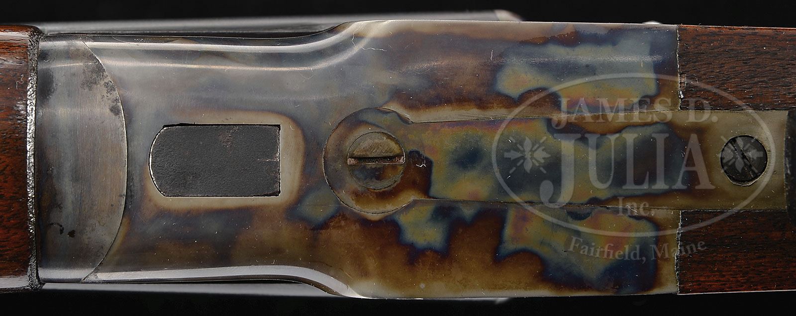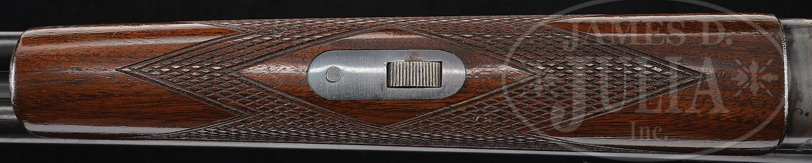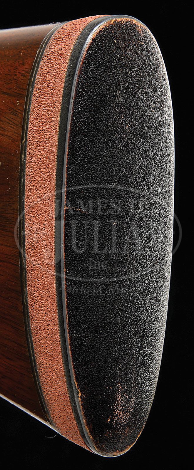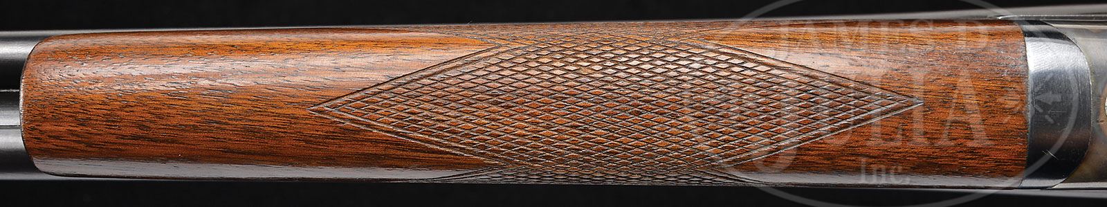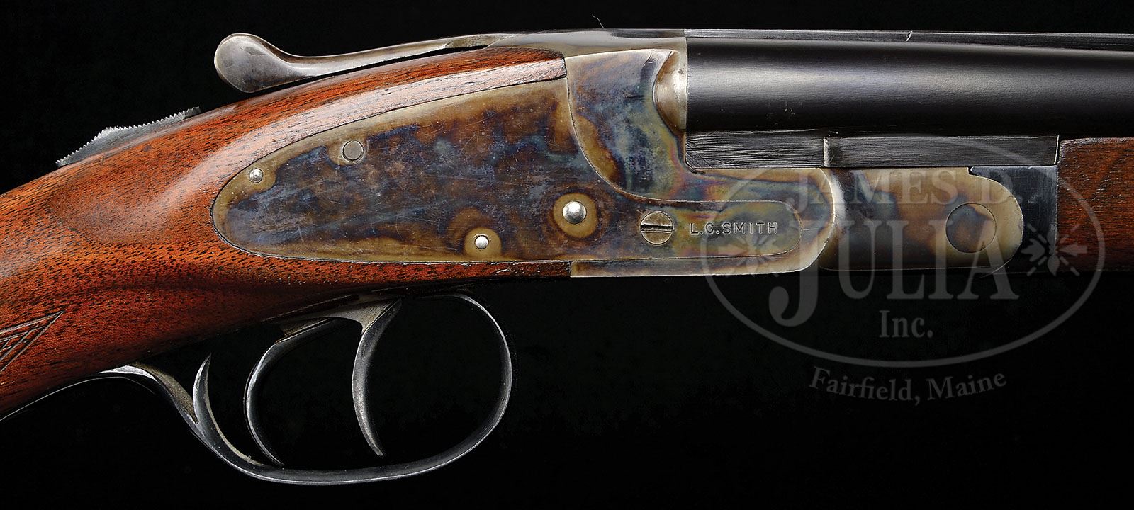 *EXCEPTIONALLY RARE, HIGH CONDITION, CONSECUTIVE PAIR OF L. C. SMITH FIELD GRADE .410S, ONE WITH EJECTORS AND CASE. SN FW183432/ FW183433. Cal. .410. 3″ Chambers. No.183432 has 26″ bbls and automatic ejectors. No. 183433 has 28″ bbls and plain extractors. Both have high, matted, single plane ribs mounted with two bronze beads. Breech ends have typical L. C. Smith Field grade markings and Hunter Arms address. Bbl flats are stamped with SNs, grade, and Hunter proofs. Bottoms of bbls are stamped “Armor Steel”. Typical case hardened actions are correctly marked on water tables, and feature automatic safeties and double triggers. No. 183432 has American walnut straight grip stock with leather faced foam recoil pad. No. 183433 has American walnut capped pistol grip stock with hard rubber buttplate. Both have splinter forends. No. 183432 has ejectors and oval secondary latch. 26″ Bbls on 183432: Bore diameter at muzzles: left-.386, right -.393. Wall thickness: left -.028, right -.026. Drop at heel: 2-1/8″, drop at comb: 1-7/16″. Weight: 5 lbs. 12 oz. LOP: 13-1/2″. 28″ Bbls no. 183433: Bore diameter at muzzles: left-.379, right -.379. Wall thickness: left -.029, right -.030. Drop at heel: 2-1/2″, drop at comb: 1-9/16″. Weight: 6 lbs. 1/2 oz. LOP: 14-1/8″. Gun no. 183432 comes with Abercrombie & Fitch marked VC leather case with stitched leather corners, which is lined in burgundy cloth. There is a black leather L C Smith label on lid, and case contains 2-pc walnut and brass cleaning rod with mop, brush and two snap caps in black leather case, along with an L C Smith marked round oil bottle. PROVENANCE: A & F records from G & H for 183432, relating configuration and history, as shown in their records, and relating that it was sold to R. B. Lanier, banker and Harvard graduate, along with his biographical info. CONDITION: Excellent. Both guns show an exceptional amount of all of their orig finishes, approaching 100%. Gun no. 183432 has some minor spotting at left front of action, and on forend iron, as well as on rib. Blue of trigger guard possibly renewed. Stock has some added oil. Gun no. 183433 is truly exceptional with only a few minor marks, and slight crazing of stock finish. Bores are excellent, actions are tight for both guns. Ejectors on 183432 are in time. Case leather is very fine, with some light water stains and a few light scrapes and marks. Interior cloth is very fine, with some slight soiling. Reproduction label is excellent, as are accessories. 4-49621 MGM138 (17,500-27,500)