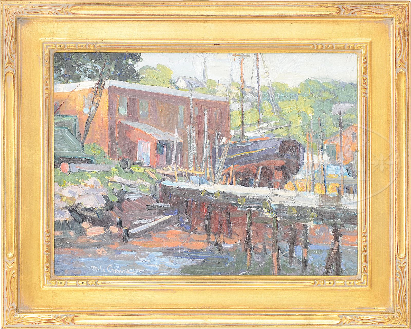 MIKE GRAVES (American, 1952- ) HARBORSIDE BOATYARD. Oil on canvas Housed in a modern carved gilt wood frame Signed “Mike Graves”, lower left SIZE: 9″ x 12″. Overall: 12-1/2″ x 15-1/2″ CONDITION: Very good to excellent 9-29546 (800-1,000)