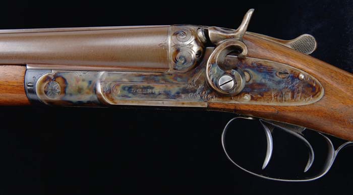 *L.C. SMITH UPGRADED TRAP HAMMER DAMASCUS DOUBLE BARREL SHOTGUN. Cal. 16 ga. SN 151533. Rare shotgun with 28” Damascus bbls choked FULL/FULL with tapered, concave, matted rib, sgl bead, crossbolt rib extension & extractor. Mounted with flat checkered, slab sawed, American walnut with splinter forearm & semi-pistol grip stock, 14-1/4” over a serrated, hard rubber buttplate. Receiver & lockplates are engraved in typical trap grade patterns of five trap shooters on left lockplate and a live pigeon shooter on right lockplate with a few flourishes of arabesque patterns. Bore diameter: left – .650, right – .651. Bore restrictions: left – .022, right – .022. Wall thickness: left – .034, right – .033. Drop at heel: 3-1/4”, drop at comb: 1-3/4”. Weight: 6 lbs. 11.84 oz. Accompanied by a Cody Firearms Museum letter identifying this shotgun as originally a Field grade, 16 ga. with 28” Best Damascus bbls finished Jan. 10, 1907. CONDITION: Very fine, as completely restored. Bbls retain a chocolate brown, Damascus pattern overall with slight muzzle edge wear. Receiver, lockplates & hammers retain brilliant case colors. Wood is sound with a satin, hand rubbed finish. Mechanics are fine, bright shiny bores with some orange peel pitting in front of chambers, has been honed. Hammer screws are replacements. 4-30198 JR171 (4,000-7,000)