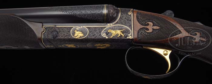 *EXHIBITION CSM BABY FRAME MODEL 21 SIDE BY SIDE SHOTGUN. SN SW38485. Cal. 28ga. 26″ bbls with matted, tapered vent rib with dual ivory sighting beads, 2-3/4″ chambers, IMP.CYL/MOD choke, ejectors and single selective trigger. Top of left bbl, in chamber area is marked “Model 21-CSM/Trademark-28 Gauge 2-3/4”. Muzzles of bbls have single gold band and 1/2″ wedge of scroll engraving. Breech end has two gold band and 2-1/2″ wedge of scroll engraving. Bottom of bbl, at forend lug, is marked on left bbl “CT. Shotgun Mfg.” and right “New Britain, CT. U.S.A.”. The tiny baby frame is beautifully engraved with foliate scroll and gold pointer and quail on left side, a single gold quail and three flushing quail on bottom, gold setter and flushing grouse on right, gold woodcock in flight on triggerguard bow and accenting, gold wire borders throughout. This work is signed on left side, below dog’s feet ABEE. SN and Safe are also inlaid in gold. Mounted with highly figured exhibition walnut, B-carved, straight grip, with engraved and gold-wire inlaid skeleton butt, and fleur-de-lis checkering. Blank gold initial oval. Beavertail B-carved forend with ebony tip insert, engraved outer forend medal with gold-wire border. Inside forend metal, ejectors, water table, standing breech, bbl flat and lugs are all finely jeweled. Bore diameter: left -.562, right -.563. Bore restrictions: left -.016, right -.010. Wall thickness: left -.035, right -.033. Drop at heel: 2-7/16″, drop at comb: 1-7/16″. Weight: 5lbs. 8oz. LOP 14″. CONDITION: Extremely fine. Virtually as new, since manufactured with just a couple tiny handling marks. Mechanics are crisp, strong ejectors and bright shiny, new bores. 4-38516 BDT17 (25,000-35,000)