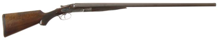 FINE SYRACUSE LEFEVER G-GRADE DAMASCUS DOUBLE BARREL SHOTGUN. Cal. 12 ga. SN 57779. Beautiful early shotgun with 30” bbls choked FULL/FULL with tapered, matted rib, sgl bead, doll’s head rib extension with third bite, extractor & dbl triggers. Mounted with very nicely figured straight grain, checkered, American walnut with splinter forearm & semi-pistol grip stock, 14” over an old crystallized, leather-faced pad. Bbls are fine Damascus pattern without any markings. Receiver & lockplates have light, foliate arabesque patterns with maker’s name on each side. Accompanied by orig hang tags which identify this shotgun along with an instruction card. Bore diameter: left – .727, right – .727. Bore restrictions: left – .033, right – .032. Wall thickness: left – .035, right – .033. Drop at heel: 2-1/4”, drop at comb: 1-3/8”. Weight: 7 lbs. 13.44 oz. CONDITION: Very fine. Bbls retain 95-96% strong, orig brown Damascus pattern, slightly thinned over chamber area. Receiver retains about 70% orig case colors, brilliant in sheltered areas, fading elsewhere and turned to silver in more exposed areas. Lockplates retain virtually all of their brilliant case colors, somewhat faded on left side. Wood is sound with minor nicks & dings and retains most of a professionally restored finish. Good mechanics, bright shiny bores. 4-30190 JR163 (3,000-5,000)
