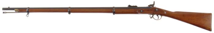 TOWER 1858 PATTERN RIFLE WITH BAYONET AND SCABBARD. Cal. .577. NSN. 39-3/16” Standard markings and features. Dated 1863 on lockplate. No issue marks. Bayonet is marked with Canadian proofs and an issue #165 on socket. CONDITION: Metal is fine with 90% blue on bbl, 70% on bbl bands, and 70% casehardening on lockplate and hammer. Stock is sanded and re-oiled. Bayonet is fine. 4-30824 (3,000-4,000)