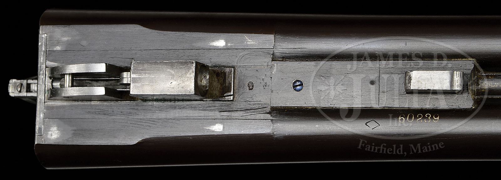 *HIGH CONDITION LEFEVER GE. SN 60239. Cal. 12 ga. 2-3/4″ Chambers. 28″ Steel ejector bbls with raised, flat, matted rib, are marked with a diamond and SN on bottom of left bbl. Case hardened action with internal ejectors and late cocking hook features automatic safety, pin type cocking indicators, and double triggers. Action is engraved with wiggle borders having light scroll flourishes, and with a larger scroll flourish at center of each lockplate, which are also stamped “LEFEVER ARMS CO SYRACUSE NY USA”. Trigger plate is marked with all patent dates, the last being 1907. Blued trigger guard has a flourish of scroll on bow. Lightly stump figured European walnut capped pistol grip buttstock has standard point pattern checkering at grip, and measures 14-1/4″ over checkered composition buttplate with circular Lefever logo. Matching splinter forend has typical Lefever snap release. Bore diameter: left-.728, right -.728. Bore restrictions: left -.039 (Full), right -.019 (Mod). Wall thickness: left -.029, right -.031. Drop at heel: 2-7/16″, drop at comb: 1-5/8″. Weight: 7 lbs. 2 oz. LOP: 14-1/4″. CONDITION: Excellent. Bbls retain approx 98% orig blue with only a few light marks. Action retains approx 90% orig case hardening color, as well as a great deal of orig varnish, silvering on bottom, and on top tang. Trigger guard retains most of its orig blue. Stocks retain nearly all of what appears to be their orig finish, possibly with added oil on butt, over some minor marks. Bores are excellent, bright and shiny. Action is tight. Ejectors are strong and in time. A fine example of what many people feel to be the most innovative and graceful shotguns made in America. 4-49265 MGM133 (3,000-5,000)
