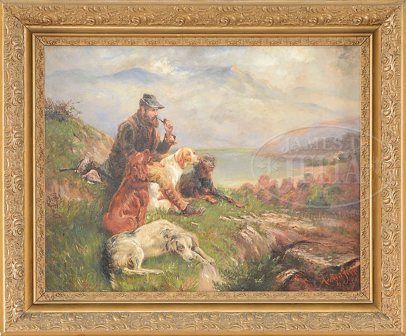 ADELBERT JENNE (Late 19th century) A HUNTER WITH HIS DOGS. Oil on canvas Housed in a period gesso decorated gilt frame Signed lower right “Adelbert Jenne 93″ SIZE: 22″ x 28″. Overall: 29-1/2″ x 35-1/2”. PROVENANCE: From a New York home CONDITION: Very good, some touch up 9-29467 (1,500-2,500)
