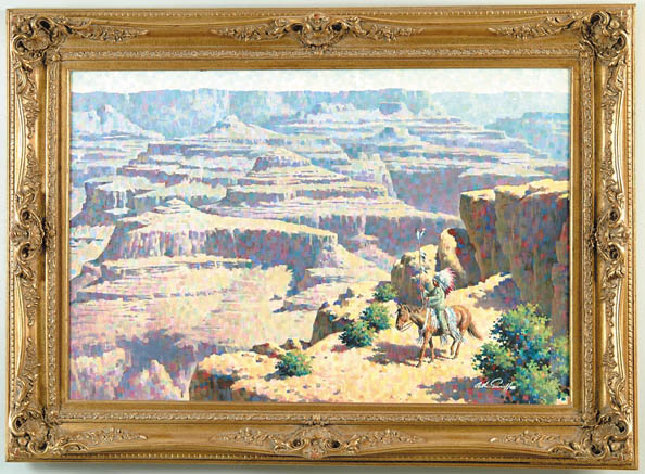 ARTHUR SARON SARNOFF (American, 1912-2000) “GRAND PANORAMA”. Large oil on canvas Western scene shows Indian chief on horseback on cliff edge overlooking the Grand Canyon. Signed lower right “Arthur Sarnoff”. Housed in a fine gesso decorated fancy gilt frame. Titled and signed on back of canvas also. SIZE: 24” x 36”. CONDITION: Very good. 9-94257 (4,500-5,500)