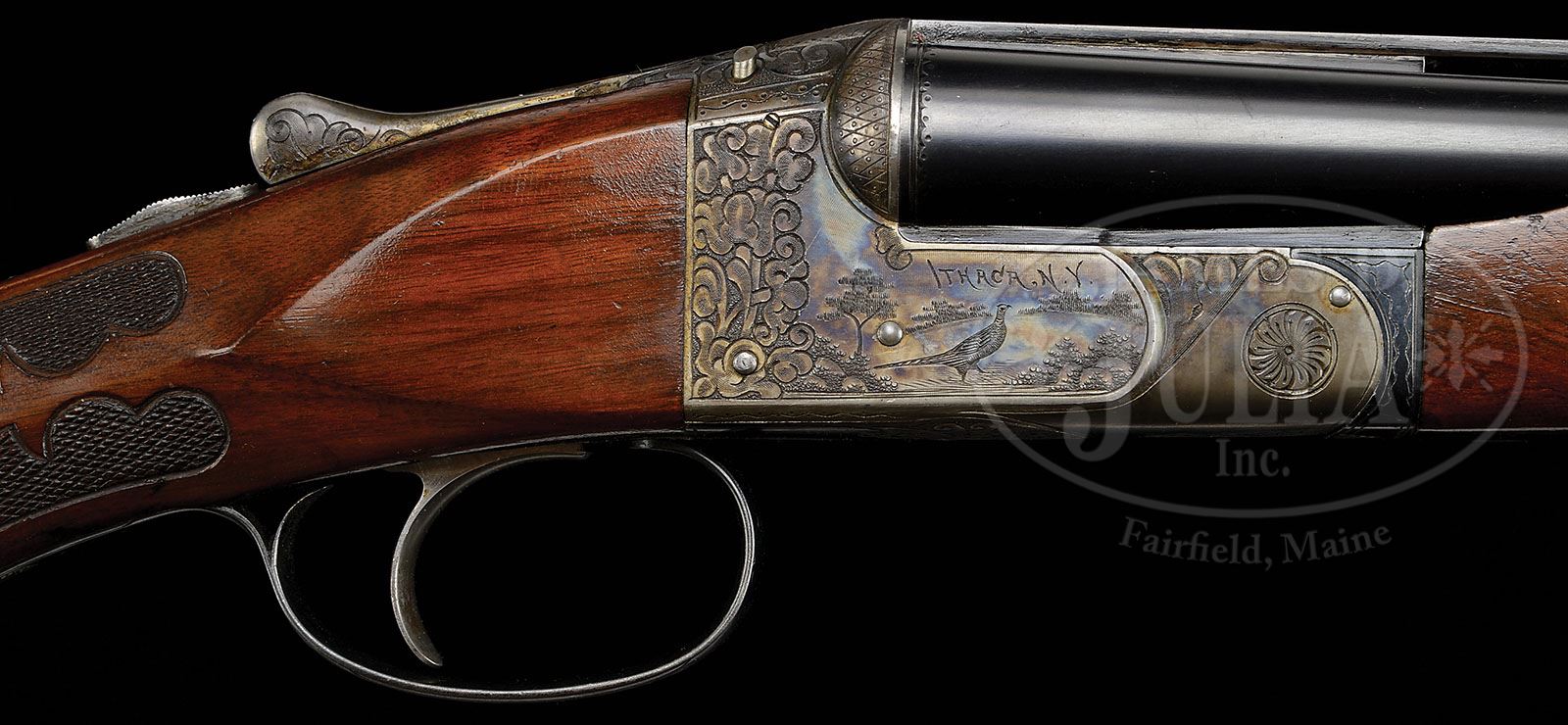 *UNUSUAL HIGH ORIGINAL CONDITION ALL OPTION 20 GAUGE ITHACA 4E DOUBLE TRAP GUN. SN 455798. Cal. 20 ga. 2-3/4″ Chambers. Rare 32″ bbls with raised, matted, ventilated rib mounted with two red beads, are stamped with SN and grade on engine turned bbl flats. Bottoms of bbls are stamped with “BEST FLUID STEEL”. Case hardened NID action with pin type cocking indicators, is fitted with Miller single selective trigger with selector on tang. Action is engraved in standard “4” style, with shaded acanthus scroll, highlighting duck and pheasant in appropriate backgrounds on either side of action, surmounted by “Ithaca Gun Co” and “Ithaca N. Y.” Shaded acanthus is on bottom of action and front of trigger plate, as well as on bow of trigger guard which has SN at grip. Nicely figured American walnut capped pistol grip buttstock measures 13-1/2″ over old, most likely original, “Jostam” open sided red pad. Checkering with fancy borders is pierced by fleur-di-lis and ribbons. Matching, short, fat, beavertail, ejector forend has inset ebony tip, reinforcing bolt, and Deeley type release. Bore diameter: left-.622, right -.617. Bore restrictions: left -.034 (Full), right -.025 (I Mod). Wall thickness: left -.032, right -.034. Drop at heel: 2-5/16″, drop at comb: 1-1/2″. Weight: 7 lbs. 5 oz. LOP: 13-1/2″. CONDITION: Exceptionally fine. Bbls retain approx 98% orig blue, with a few light marks and scratches. Action retains over 95% of its orig case hardening color, just thinned slightly around bottom, with some silvering on fences, top lever, and tang. Trigger guard retains over 90% of its orig bright blue, slightly silvered on bow. Stocks retain nearly all of their orig varnish finish with a number of light marks and scratches. Checkering darkened, but with minimal wear. Bores are excellent, bright and shiny throughout. Engine turning of bbl flats and breech end of bbls is bright. Action is tight. Ejectors are slightly out of time. Trigger works. Only 560 4E NID’s were made. Guns in this particular configuration, in 20 ga., with the unusual 32″ bbls, can only be a handful. 4-48867 MGM156 (8,500-12,000)