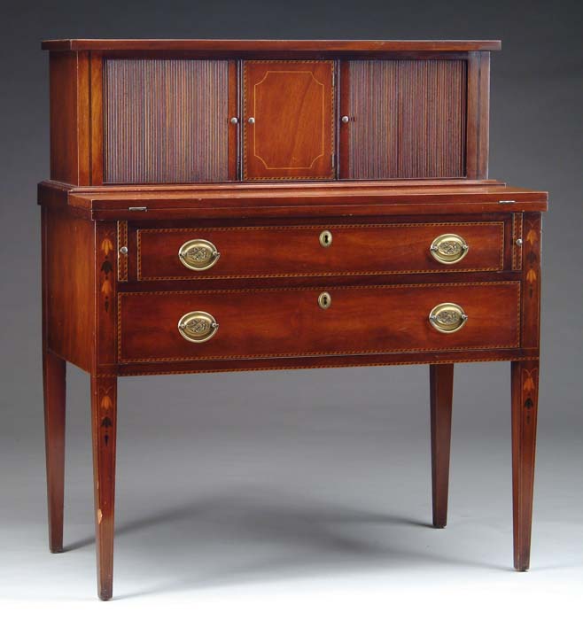 HEPPLEWHITE STYLE INLAID MAHOGANY TAMBOUR SECRETARY BY PAINE FURNITURE. Two sections having a desk interior top with tambour slides, three drawer interior with cubby holes and central inlaid drawer. Bottom section having two drawers, tapered square legs, bellflower inlay and other inlay and foldover writing surface. SIZE: 43” h x 37-1/4” at widest x 19-1/2” at deepest. CONDITION: Generally very good, small nicks. 9-72252 (600-800)