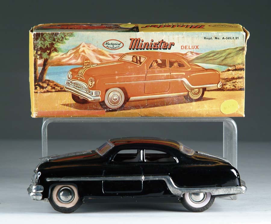 TIN “MINISTER DELUXE” AUTO IN BOX. This tin auto painted in original black slightly resembles an old Buick. “Mechanical and Automatic”. Retains original lithograph box. SIZE: Auto approximately 9” l. CONDITION: The automobile is generally very good to excellent. The box shows wear and with a couple of imperfections, but generally very good. 1-4678 (150-250) Auction: Advertising, Toy & Doll - Spring 2005 Please Note: All prices include the hammer price plus the buyer’s premium, which is paid by the buyer as part of the purchase price. The prices noted here after the auction are considered unofficial and do not become official until after the 46th day. |