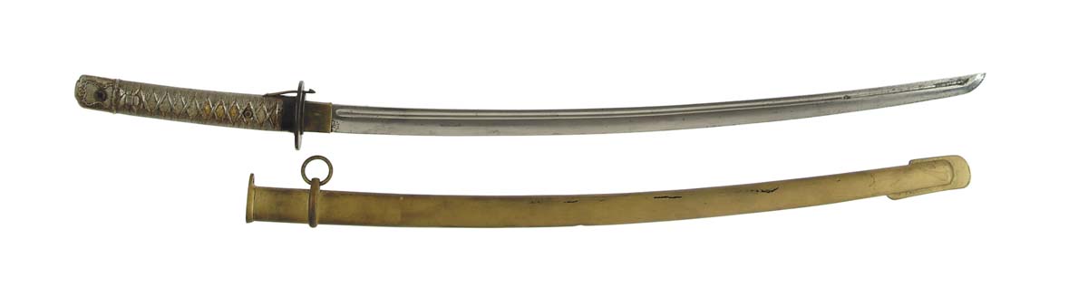 JAPANESE WWII NCO SWORD. 26 3/8” plated grooved blade. Matching serial numbers. SIZE: 38” long overall. MOUNTS: Complete NCO. CONDITION: Blade has some loss to the plated finish mostly in the point area. Wear to the hilt finish and scabbard has been repainted gold. No tassel. 4-54992-12 GA28 (200-300)