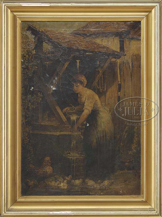 SIGNED (19th/20th Century) WOMAN AT THE WELL. Nice quality oil on canvas which has a brown on brown illegible signature lower right. Scene shows a young woman at a well filling a bucket with water and a family of chickens is on the ground beside. Housed in a gilt wood frame. SIZE: 25-1/2″ x 17-1/2″. CONDITION: In need of restoration with small punctures, craquelure, and surface dirt. 9-23622 (150-250)