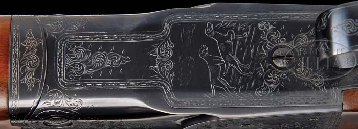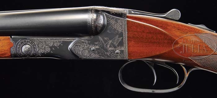 *FACTORY RESTORED AND UPGRADED WINCHESTER MODEL 21. SN 1761. Cal. 12ga. 26″ bbls with tapered, matted concave rib, single silver sighting bead, 2-3/4″ chambers, CYL/MOD choke, extractors and double triggers. Chamber area of right bbl is marked “Model 21-Winchester/Trademark-12 Gauge”, left bbl is marked “Made in U.S.A. Winchester Repeating Arms Co./ New Haven. Conn.-Patents Pending”. There is a narrow band of scroll engraving at breech end. Receiver has been engraved by Nick Kusmit in a factory No. 4 pattern with 2 ducks taking flight on left side, 2 quail in flight on right side, and pointer and setter on point on trigger plate, with balance an open foliate scroll. Below ducks on left side are the initials NK. Serial Number and Safe have been inlaid with gold. Mounted with straight grain walnut, checkered semi-pistol grip, Winchester hard rubber buttplate, and checkered, splintered forend. Bore diameter: left -.729, right -.729. Bore restrictions: left -.011, right -.000. Wall thickness: left -.036, right -.041. Drop at heel: 2-5/8″, drop at comb1-5/8″: . Weight: 6lbs. 15oz. LOP 14″. Accompanied gun are two letters. One from Nick Kusmit stating that he engraved the gun is 21-4 pattern and that the factory refinished the receiver. Second letter is from Ed Ulrich, which is hand written, stating that he requested Nick Kusmit to engrave the gun in a 21-4 pattern and have the factory refinish the gun. CONDITION: Extremely fine. Gun appears as new from factory restoration with only a few minor handling marks showing in the stock. Triggers are crisp with automatic safety and bright shiny bores. 4-38399 BDT12 (6,500-9,500)