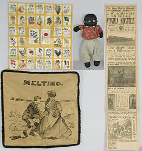 LOT OF FOUR ITEMS. Include a black cloth homemade doll, small quilt throw made from early tobacco cigarette silks with thirty-eight different silks. An old black and white poster for J.W. Johnson’s Virginia Minstrels for 1923 show with “colored people”. Finally, turn of the century pillow case with a Charles Darner Gibson transfer of two skaters sparking. SIZE: Varies. CONDITION: Generally good. 1-26874 (200-400) Auction: Advertising, Toy & Doll - Fall 2001 Please Note: All prices include the hammer price plus the buyer’s premium, which is paid by the buyer as part of the purchase price. The prices noted here after the auction are considered unofficial and do not become official until after the 46th day. |