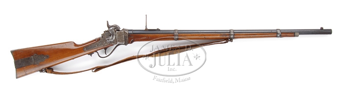 SHARPS NEW MODEL 1863 3-BAND RIFLE. SN C33084. Cal. 52. Usual configuration with 30″ rnd bbl, square base front sight/bayonet lug with German silver blade and 800 yard Lawrence Patent ladder rear sight. Bbl has usual markings as does receiver & lockplate. Mounted in uncheckered, American walnut with long forearm & three bands with straight stock and smooth steel buttplate. Right side of buttstock has an 1859 style steel patch box. Left wrist has two legible cartouches and there are small inspector initials on most of the visible parts. Accompanied by the remnants of a worn, dry & fragile orig sling. These Sharps rifles were used to great effect throughout the Civil War. CONDITION: Fine. Bbl retains about 90% strong orig blue with only slight muzzle wear and a few scattered spots of light rust. Receiver, lockplate, bands & buttplate are a silver metal color with traces of faded case colors around hammer. Wood is sound with light handling & use nicks & scratches and retains most of a very old varnish refinish which has somewhat crackled. Sling loops show moderate to heavy rust and there is some staining around toe. Mechanics are fine, strong bore with scattered pitting. Sling is poor with broken end. 4-31800 JR187 (5,500-7,500)