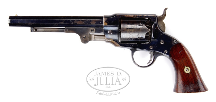 ROGERS & SPENCER ARMY PERCUSSION REVOLVER. SN 3133. Cal. 44. Blue finish with 7-1/2″ oct bbl, usual markings on top strap with crisp inspector cartouche on left grip and small inspector marks on various parts. CONDITION: Very fine, all matching including rammer & grips, probably unfired. Overall retains 70-75% glossy orig blue with flaked areas flaked, not worn, to a medium patina. Rammer, handle & hammer retain dark case colors. Grips have minor chips on flared edges and retain most of their orig varnish. Mechanics are crisp, brilliant shiny bore. 4-31575 JR385 (2,500-4,000)