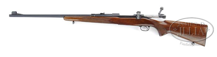*HARD TO FIND WINCHESTER PRE-64 MODEL 70 RIFLE. SN 89431. Cal. 250-3000 Savage. 24″ rnd bbl. Integral front ramp with dovetailed fine bead sight and sight hood. 22G rear sight, left side of bbl is marked “MADE IN NEW HAVEN, CONN. U.S. OF AMERICA/WINCHESTER PROOF STEEL-WINCHESTER/TRADE MARK-MODEL 70-250-3000SAV.” Standard receiver with Winchester/Trade Mark center left side and equipped with Lyman WJS sight. Mounted with nicely figured straight grain walnut, checkered panels on each side of forearm, checkered pistol grip, straight comb, checkered steel butt plate, and closed loop sling swivels. Bolt is equipped with type 2 safety. Bottom of bbl is dated 48. Magazine box, follower, and extractor collar are all proper for this caliber. CONDITION: Fine. Bbl and action retain 95-98% orig blue, with some minor muzzle wear and a few minor nicks and scuffs. Bolt knob has orig blue, but is starting to wear to a silver patina. Floor plate and trigger guard are a fine factory quality restored blue finish. Stock is sound, with good checkering, a few minor nicks and dings and retains nearly all of a fine, light coat of added finish. Mechanics are good, with a shiny bore. 4-36268 BDT18 (3,000-5,000)