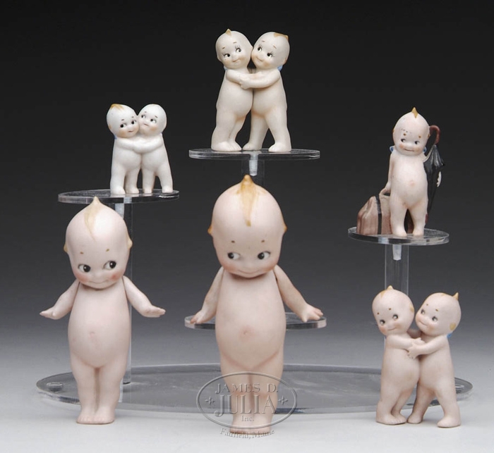 SIX BISQUE CUPIE DOLLS. Unsigned. As follows: 6-1/2” with separate arms; 6” with separate arms; 3-1/2” with umbrella and travel bag; Two 3-1/2” hugging cupies and a 2-1/2” hugging cupie. CONDITION: Very good. 9-28591 (250-400)
