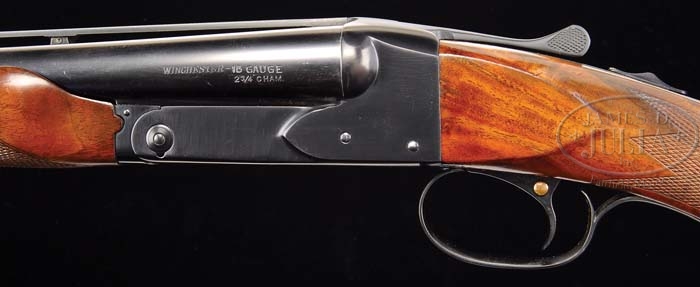 *VERY RARE WINCHESTER MODEL 21 DELUXE FIELD GRADE WITH VENT RIB. SN 13140. Cal. 16ga. 28″ bbls with matted, tapered, ventilated rib, dual silver sighting beads, 2-3/4″ chambers MOD/FULL/CHOKE, ejectors and single selective trigger. Side of left bbl is marked “Winchester 16 Gauge/2-3/4″ Cham.” Standard frame with trigger plate stamped Deluxe over screw and Field beneath. Mounted with highly figured walnut, checkered pistol grip with Winchester hard rubber gripcap, Winchester solid red pad, and fully checkered beavertail forend. Bore diameter: left -.667, right -.665. Bore restrictions: left -.025, right -.008. Wall thickness: left -.034, right -.033. Drop at heel: 2-5/8″”, drop at comb: 1-5/8″. Weight: 7lbs. 5 oz. LOP 13-3/4″. Accompanied by a copy of a Cody Firearms Museum email identifying gun as a 16ga, 28″, modified and full, single trigger, selective ejectors, automatic safety, pistol grip, deluxe field, vent rib, Winchester pad, pitch 2-1/2″, pull 13-3/4″, drop at heel 2-5/8″, drop at comb 1-5/8″, completion date 9/11/49. CONDITION: Very fine. Bbls retain 95% orig blue with some minor nicks and scratches, minor muzzle wear, rub mark from forend and some faint thinning in chamber area. Frame retains virtually all of probably factory restored finish, stock is sound with a tiny hairline behind top tang, usual minor handling marks and retains most of a light coat of added finish. Forend is sound with usual light handling marks with most of its orig finish blending with hand worn patina. The recoil pad is likely a factory replacement. Mechanics are crisp with automatic safety with ejectors strong and nice shiny bores. 4-38751 BDT7 (8,500-10,000)