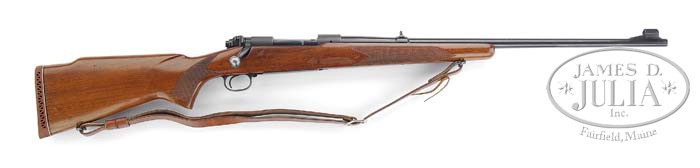 *WINCHESTER PRE-64 MODEL 70 STANDARD GRADE RIFLE. SN 259255. Cal. 30.6. 24″ rnd bbl, front sight ramp, fine bead front sight with sight hood, flip up rear sight. Standard Model 70 action with “WINCHESTER/TRADE MARK” center left side. Mounted with straight grain walnut, checkered panels on each side of forend, factory closed loop swivel, checkered pistol grip stock, Monte Carlo, Red Pachmayr vented recoil pad, factory closed loop sling swivel, equipped with an adjustable leather sling. CONDITION: Fine. Bbl retains 90-95% orig blue with minor handling marks, some minor thinning in front of rear sight and the usual nicks and dings. The matte finish receiver has nearly all of its orig finish, with a small rub mark on the rear bridge behind front hole. Trigger guard and floor plate retina most of their orig finish with some minor sharp edge wear. Stock is sound with minor nicks, dings & hunting bruises, some areas of flaked finish, but retains 90% of its orig varnish. Mechanics are fine with a good bore and some minor scattered shallow pitting. 4-38053 BDT138 (750-1,250)