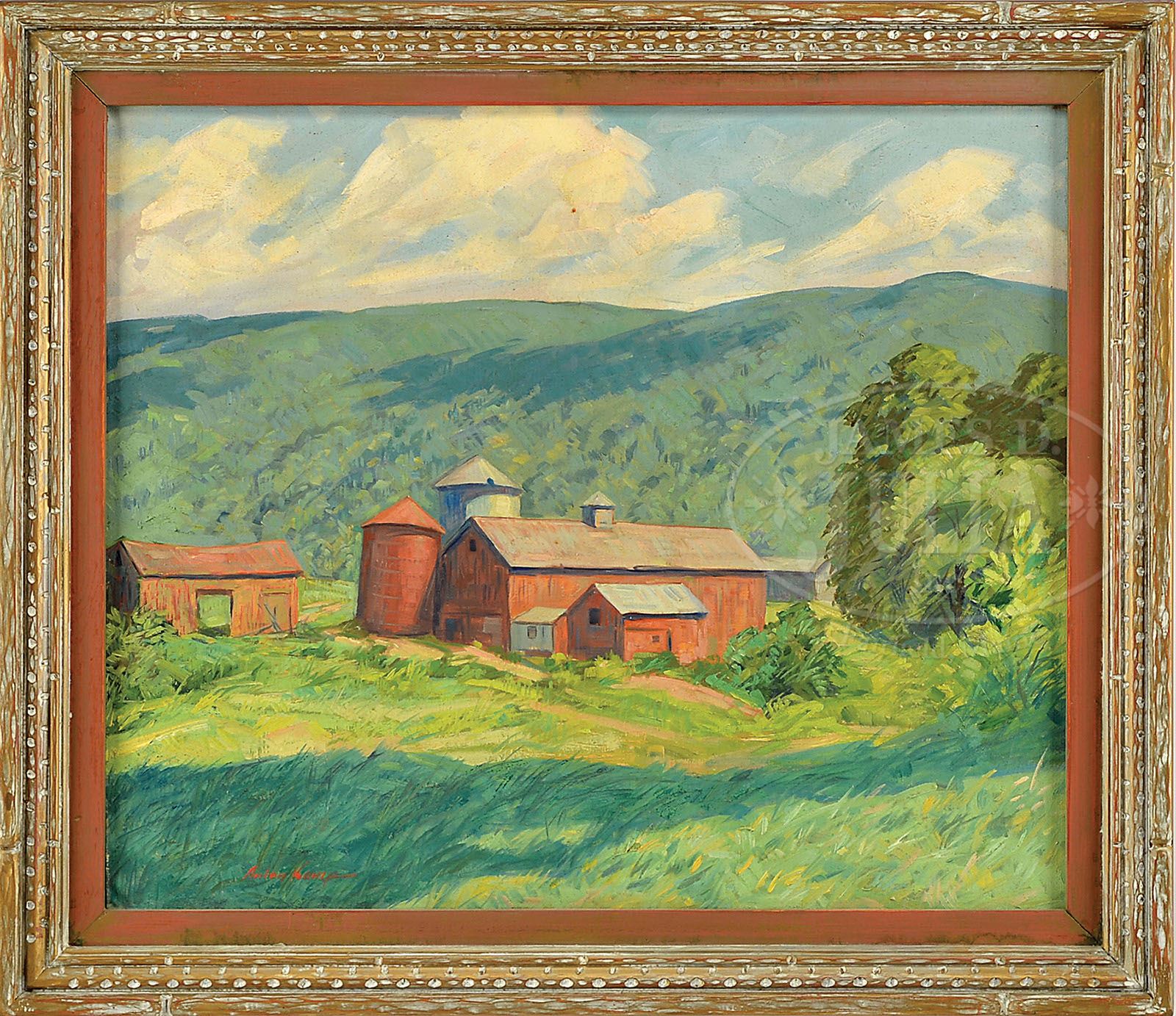 ANTON KAMP (American, 1895-1985) “DUTCHESS COUNTY FARM”. Oil on canvas Housed in a carved and partial gilt wood frame Signed lower left “Anton Kamp”, also title and signed with estate stamp on verso of stretcher SIZE: 25″ x 30″. Overall: 31″ x 36″. CONDITION: Very good. 9-29089 (1,000-1,500)