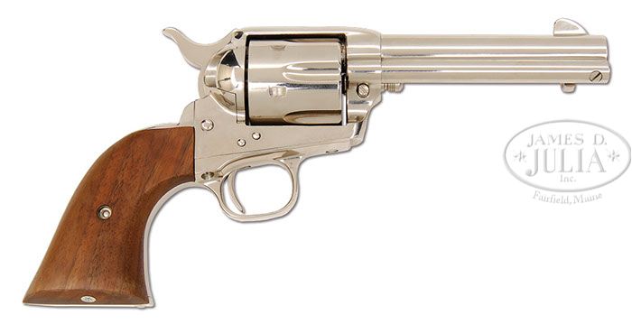 *NICKEL THIRD GENERATION COLT SINGLE ACTION ARMY REVOLVER. SN SA55146. Cal 45 Colt. Bbl 4-3/4″. This full nickel finished revolver is fitted with walnut grips. Accompanied by the original wood grain box with foam liners containing sealed paperwork packet, yellow warning tag and Colt congratulatory letter. CONDITION: It appears to be as new and in unfired condition. 4-46585 (2,500-4,000)