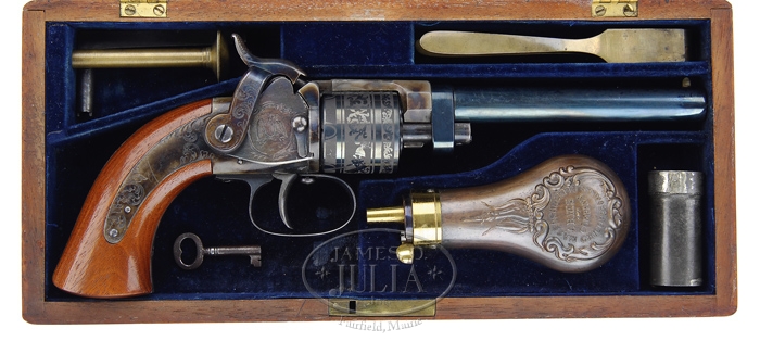 SPECTACULAR CASED MASS ARMS BELT REVOLVER. SN 84. Cal. 31. This wonderful revolver appears new & unfired. It has 5″ rnd bbl, 6-shot etch-engraved cylinder with hand engraved frame with about 50% coverage fine foliate arabesque patterns which extend down lockplate and on hammer. It has the Maynard tape priming system with a beautifully engraved compartment cover with a spread-winged American eagle and Maynard’s patent information. It has usual Mass Arms markings on top strap & 2-pc checkered walnut grips. Accompanied by its orig walnut casing with blue velvet lining with “HITCHCOCK & CO” distributor’s label inside lid and compartmented in bottom for revolver, a beautiful orig Mass Arms flask with company info on one side and a fine early American eagle on other. It also has an orig tin for rolls of primers containing three complete & one partial rolls of orig primers. Back edge has compartment for an orig 2-cavity brass mold, a brass rammer, L-shaped nipple wrench and orig functioning key along with a few lead balls. According to Flayderman’s Guide to Antique American Firearms there were only about 1,000 of these revolvers made in period 1851-57. This revolver is without the 1850 patent date on bbl. CONDITION: Exceptionally fine. Appears to be unfired retaining virtually all of its glossy orig blue on bbl, cylinder & trigger guard and about all of its brilliant case colors on frame, top strap, trigger, hammer & lockplate and about all of its orig silver on backstrap. Grips are equally new with no visible flaws, retaining virtually all of their orig varnish. Case is extremely fine with minor nicks & scratches retaining virtually all of its orig factory varnish. Interior is rich & dark with only very minor wear from revolver. Flask is equally new, retaining virtually all of its orig finish. Mold is also as new. A truly exceptional & rare set. 4-31526 JR183 (15,000-25,000)