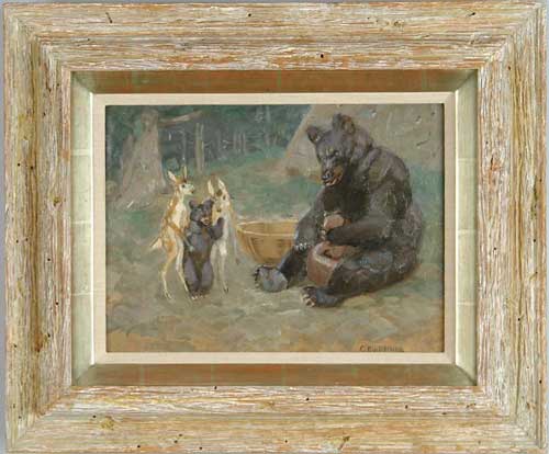 EDWIN W. DEMING (American, 1860-1942) “THE BEAR AND FAWNS”. Oil on board illustration published in The Dawn of the World by C. Hart Merriam, page 105. Caption “The Fawns Asking Mother Bear If They May Play With Her Baby”. Scene shows two small deer holding small bear next to large seated bear in a forest setting. Signed lower right “E W Deming”. Housed in a naturalistic wood frame with gold and linen liner. PROVENANCE: Sotheby’s Arcade, New York Dec. 17th, 1990. SIZE: 11-1/2” x 15-1/2”. CONDITION: Very good. 9-99579 (1,000-2,000)