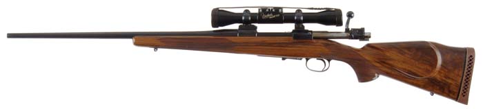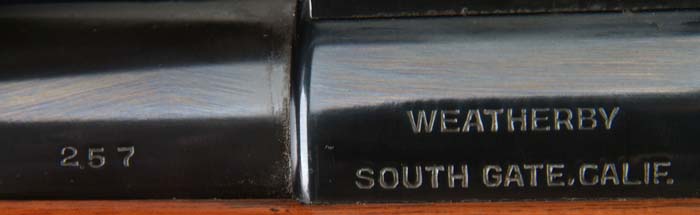 *SCARCE SOUTH GATE WEATHERBY BOLT ACTION RIFLE. Cal. 257 Weatherby Mag. SN 357. Wonderful lightweight sporter built on a Mauser action with 22” tapered, lightweight bbl without sights. Receiver is mounted with Buehler bases & rings containing a Weatherby Imperial German-made 4X scope with orig leather covers. The bolt body & extractor are jeweled and bolt knob has a checkered flat on bottom. It is mounted in very nicely figured, streaky, Claro American walnut 1-pc stock with extensively checkered forearm and pistol grip with Monte Carlo comb and shadow cheekpiece, 13-1/4” over a Pachmayr waffle pad. It has sling swivel studs in bottom and a checkered Niedner steel grip cap. It also has a Jaeger trigger. Floorplate & triggerguard are spectacularly engraved with a silver chamois in a mountain scene and raised silver initials “FHR” on trigger bow, all surrounded by full coverage, very well executed, foliate arabesque patterns. CONDITION: Extremely fine, near new, possibly unfired. Retains virtually all of its orig factory finish to both metal & wood. Mechanics are crisp, brilliant shiny bore. 4-30872 JR230 (2,000-3,000)