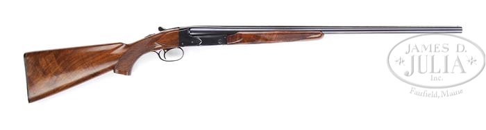 *OUTSTANDING WINCHESTER MODEL 21 SIDE BY SIDE SHOTGUN. SN 28028. Cal. 20 ga. 26″ bbls. Matted, tapered, concave rib with single silver sighting bead. 2-3/4″ chambers, IMP.CYL/MOD. Single selective trigger and ejectors. Side of left bbl is marked “Model 21-WInchester Trademark-20 Gauge 2-3/4″” Standard receiver mounted with nicely figured walnut, checkered pistol grip, and Winchester hard rubber buttplate. Checkered, beavertail forend. Bore diameter: left -.613, right -.613. Bore restrictions: left -.012, right -.008. Wall thickness: left -.037, right -.041. Drop at heel: 2-5/8″ , drop at comb:1-5/8″ . Weight: 6lbs. 12oz. LOP 14″. CONDITION: Extremely fine. Bbls retain 97-99% orig blue, with faint rub mark from forend and a small, clean spot about 7″ from muzzle on left bbl. Receiver retains about 95% of its orig blue finish with some typical flaking on trigger plate, blending with brown and gray patina. Stock is sound and retains most of its orig finish with some minor, light handling marks and some flaking at toe of buttplate. Forend is sound retaining most of its orig finish with minor nicks and dings and slight thinning near forend iron. Mechanics are crisp with automatic safety, strong ejectors and bright, shiny bores as gun shows very little use. 4-38750 BDT3 (7,000-10,000)