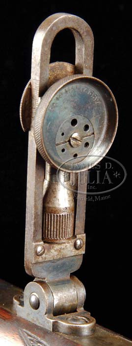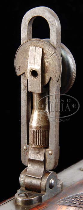 RARE MAYNARD MODEL 1882 IMPROVED NO. 16 DELUXE TARGET RIFLE WITH TWO BARRELS. SN 1865. Cal. Appears to be 35-30 or 35-40 Maynard & 32 Ballard Extra Long. 35 caliber bbl is 30″, oct to rnd with globe front sight and semi-buckhorn rear sight. Receiver has the “1882” date on right side with usual frame markings on both sides. Top tang is mounted with the rare Farrow vernier sight with multiple adjustments for aperture size and also for windage. The orig tang sight stud is still present. Mounted with highly figured checkered American walnut with semi-schnable tip forearm and pistol grip stock with nickeled brass Swiss buttplate. Trigger is checkered. The 32 caliber bbl is 28″, oct to rnd with Beech’s combination front sight and no provision for a rear sight and semi-schnable tip forearm. Neither bbl is matching numbered to receiver. PROVENANCE: David D. Sobel Single Shot Rifle Collection. CONDITION: 35 caliber bbl retains 95-96% strong orig blue with a small crack in the right ear of the forearm. Bright shiny bore. The 32 caliber bbl retains about 50% thin orig blue with a crack in the left ear of the forearm. Bright shiny bore. Receiver retains most of its lightly to moderately faded case colors, possibly an old restoration. Buttstock is sound with light handling & use marks and retains most of its orig varnish. Both forearms retain strong orig varnish. Buttplate retains most of its orig nickel turned milky. Mechanics are crisp. 4-39123 JR37 (4,000-7,000)