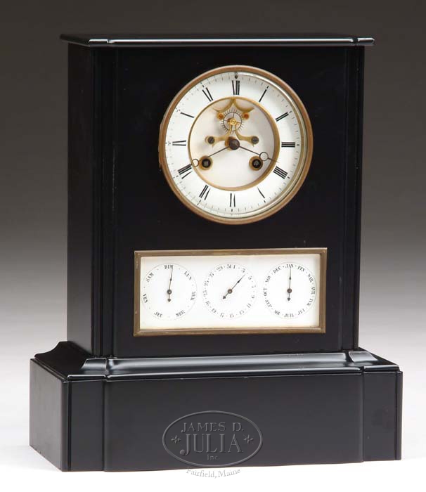 FINE FRENCH BLACK SLATE TWO DIAL MANTLE CLOCK. Top round dial with brocot escapement and beveled glass bezel. Having a rectangular dial with three separate round dials indicating month, day, and date. A fine case with molded edge base. Brass works signed “Baschet Baillier, Paris No. 12379”. Pendulum present, no key. SIZE: 15-1/4” h x 12-3/4” w x 6-1/4” d. CONDITION: Very good. 9-71426 (1,200-1,600)