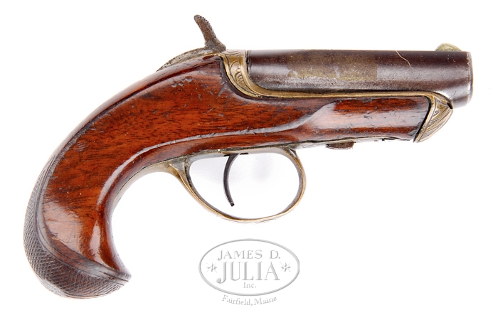WILLIAMSON POCKET DERRINGER SN 6939. Cal. 41 RF. Small convertible sgl shot derringer usable as either rimfire cartridge or, with special adaptor, as a muzzle loader, adaptor not present. It has a 2-1/2” ovoid shaped bbl with an arrow on top flat and a tiny German silver front sight. It has an engraved brass frame with brass trigger guard and 1-pc bird head walnut grip, checkered on butt. PROVENANCE: Glenn Marsh Collection CONDITION: Good. No orig finish remains with bbl a plum/brown patina and brass a very dark mustard patina. Grip is sound and retains about 85% orig varnish. Hammer does not have safety notch, otherwise mechanics are fine, strong bore with moderate pitting. 4-59634 JR590 (250-500)