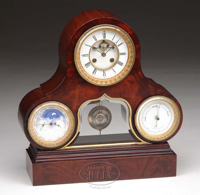 OUTSTANDING FRENCH MAHOGANY THREE DIAL 19TH CENTURY MANTLE CLOCK. Three lobed mahogany case has a top central dial with open brocot escapement, white dial marked “242” on the back plate. Right lower dial being an Aneroid barometer and the left lower dial being a calendar, date and day indicator dial with changing moon inner inset dial. Beveled shaped pendulum window has decorative pendulum behind. Circa 1870. SIZE: 19-1/2” h x 19” at widest x 6-1/4” d. CONDITION: Very good. 9-71425 (2,500-3,500)