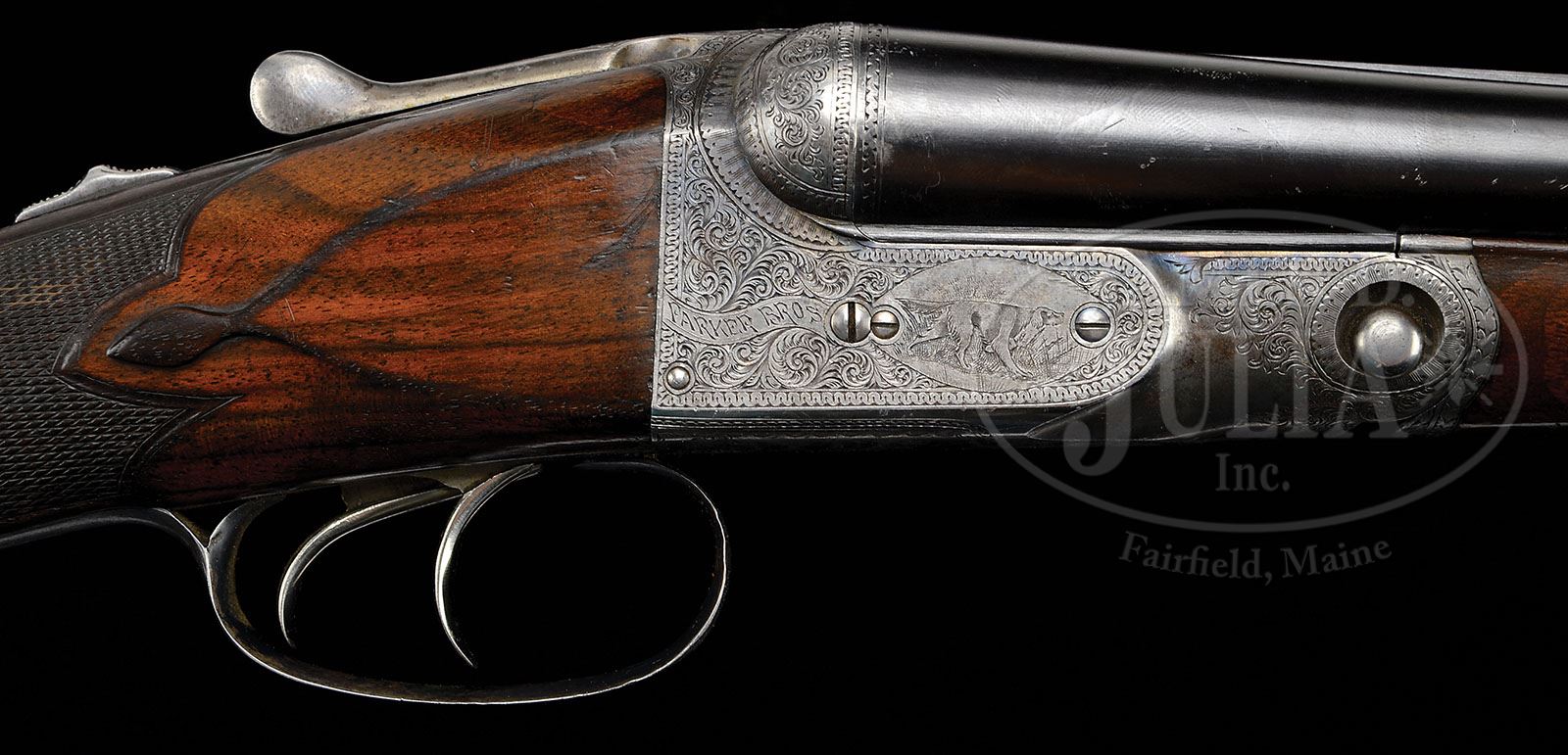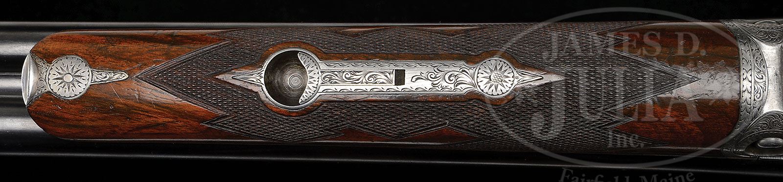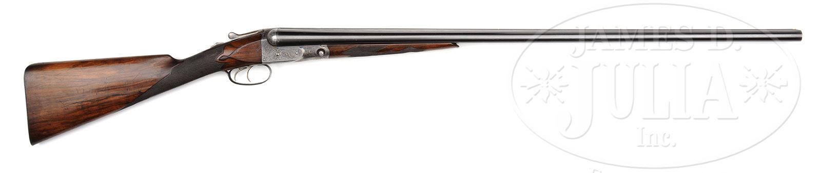 *VERY RARE 16 GAUGE PARKER CHE WITH 32 INCH BARRELS AND CASE. SN 171268. Cal. 16 ga. 2-3/4″ Chambers. No. 1 Frame. 32″ Bbls (THE PARKER STORY lists only 4 32″ bbl 16 ga. CH grades in all bbl types, all four noted are Acme Steel). Rib is marked with Parker name, address and Acme Steel, and is fitted with two ivory beads. Bbl flats have all correct markings. Case hardened “C” action is fitted with automatic safety and nickel-plated double triggers, and has all correct markings on water table. Action is engraved in typical “C” style with deeply cut medium scroll and geometric borders, surrounding well detailed vignettes of dogs on sides; pointer on left, setter on right, and with “Parker Bros” in riband at rear. Trigger plate depicts bounding stag with mountains and trees in background. Scroll engraved trigger guard has SN at grip. Nicely veined and lightly figured European walnut straight grip buttstock measures 13-3/4″ over typical skeleton steel buttplate. Correctly styled “C” pattern fancy checkering with mullered borders is at grip. A large silver oval engraved “F K” is on toe line. Matching splinter ejector forend has correct steel tip and latch. Bore diameter: left-.662, right -.662. Bore restrictions: left -.025 (Full), right -.023 (Full). Wall thickness: left -.022, right -.025. Drop at heel: 2-1/8″, drop at comb: 1-9/16″. Weight: 7 lbs. 4 oz. LOP: 13-3/4″. Heavy Heiser type (unmarked) embossed leather “leg o’ mutton” case is lined in green cloth, and contains green bags for bbls and action. CONDITION: Very fine, as found, original. Bbls retain approx 90% orig blue with numerous light scratches and marks, silvering at muzzles and breech ends. Action retains a considerable amount, perhaps 30% orig case hardening color, quite strong where protected, under beads and top lever, remainder silver gray to pewter, with some slight browning on bottom. Trigger guard has traces of orig blue, but is mostly silver to gray brown. Stocks retain most of their orig finish worn through and oil darkened on high points, around grip, and at toe, with a number of minor marks and scratches, some deeper on left side of stock, and an old large scratch on right. Checkering at grip is slightly worn, and has not been re-cut. Forend has possibly been re-cut. Bores are excellent. Action is tight. Bbls are on face. Ejectors are in time. Case leather has been stained black, and has numerous marks and scuffs; cover and handle detached. A sleek long barreled gun with good dimensions. 4-47871 MGM173 (15,000-30,000)