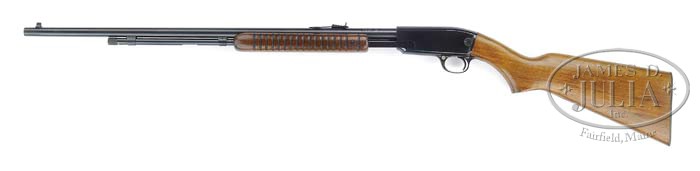 *MINTY WINCHESTER MODEL 61 GROOVE TOP PUMP ACTION RIFLE. SN 318779. Cal. 22 S,L or LR. 24″ rnd bbl with dovetail fine bead front sight and 32B rear sight. Left side of bbl is marked “WINCHESTER/TRADE MARK/MADE IN U.S.A.-MODEL 61/22 S.L.OR L.R.” Late style model 61 receiver with grooved top for 22 tip off rings. Mounted with straight grain walnut, 17 ring flat bottom forearm, uncheckered pistol grip stock with checkered steel buttplate. CONDITION: Extremely fine and near new. Bbl and mag tube retain 99% orig factory blue with some very tiny handling marks and faint rub line on mag tube from forend. Sharp edge of slide bar are just starting to show bright. Receiver retains 99% orig blue with a few faint light handling marks. Stock is sound with only a couple minor little marks and retains virtually all of its fine orig finish. Forend is sound with a tiny scratch and a couple minor tiny marks and retains virtually all of its fine orig finish. Mechanics are crisp with bright shiny bore as gun appears to be test fired only. 4-37465 BDT66 (950-1,450)