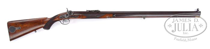 RARE ALEXANDER HENRY LONG RANGE PERCUSSION TARGET RIFLE. SN 718. Cal. .45 (.479 diameter).Seven groove Henry rifling. 32″ Slightly swamped octagonal nicely figured Damascus bbl is engraved “Alex’r Henry 8 South St. Andrew St. Edinburgh.” on rear of top flat, and “Patent No. 306 Gauge 451.” in front of rear sight. Remainder of top flat is file cut. Folding vernier rear sight is graduated from 100 to 1200 yards. “V” shaped leaf has inlaid platinum line. Globe type front sight has fine silver bead and cross-wire reticle, is adjustable for windage, and is dovetailed through top flat. Twist bottom rib has two ramrod pipes, the rearmost with sling eye. Greenheart ramrod has grooved brass head, and knurled brass tail. Ramrod is stamped with SN. Bottom of bbl is stamped with SN, “A.H”, British provisional and view proofs, and “50” is stamped 3 times. Case hardened breech plug is engraved with some scroll, and stylized lion’s head. Patent breech has inset metal blowout. SN is on hook. Breech iron is very nicely engraved with shaded open scroll. Front action sidelock has rear mounted sliding safety, and is engraved with naive vignette of tiger chasing a buck. There is more very finely cut scroll engraving behind hammer and “Alex’r Henry” is on bottom of lockplate. Finely filed and engraved hammer has dolphin head. Trigger plate terminates in stylized pineapple with scroll body. Trigger guard has prowling tiger surrounded by scroll. SN and more scroll is on tang. Dense and lightly figured European walnut full pistol grip buttstock measures 14-1/4″ over engraved steel butt plate with recumbent doe surrounded by scroll on medium length tang. Round hinged patchbox is on right side of stock, the central motif of which is a leaping stag. Patchbox contains two spare nipples, and a slip of paper with “Load: 560 Gr bullet 80 GRS 2F”. Vacant oval sling loop and SN are on toe line. Grip is checkered at 18 LPI with mullered borders, and ends with an engraved steel cap with trap. Forend is checkered to match grip, has a horn cap, and nicely filed steel thimble. Bbl mounts to stock with side nail running through elliptical steel escutcheons with circular extensions. Weight: 10 lbs. 2.6 oz. Display case has an oak base with Plexiglas sides and top. CONDITION: Very fine, as refurbished. Bbl retains 98% very finely polished brown finish with excellent definition to Damascus figure. Engraving is sharp and clear. Breech plug, iron, and lockplate retain virtually all London quality case color with engraving picked up. Hammer is silver gray, as is safety bolt. Trigger guard and buttplate retain virtually all of a correct charcoal blue, again with engraving expertly restored. Grip cap and patchbox have all of a re-case color, somewhat dull, over some pitting. Stock retains most all of a high quality hand rubbed oil finish with a number of marks from handling and use. Checkering has been re-cut. Bore is excellent, bright and shiny. Lock is crisp. Display case is fine. A very rare rifle, with nearly all extremely high quality restoration carried out, needing only some attention to details necessary to make it truly spectacular. 4-36382 (10,000-15,000)