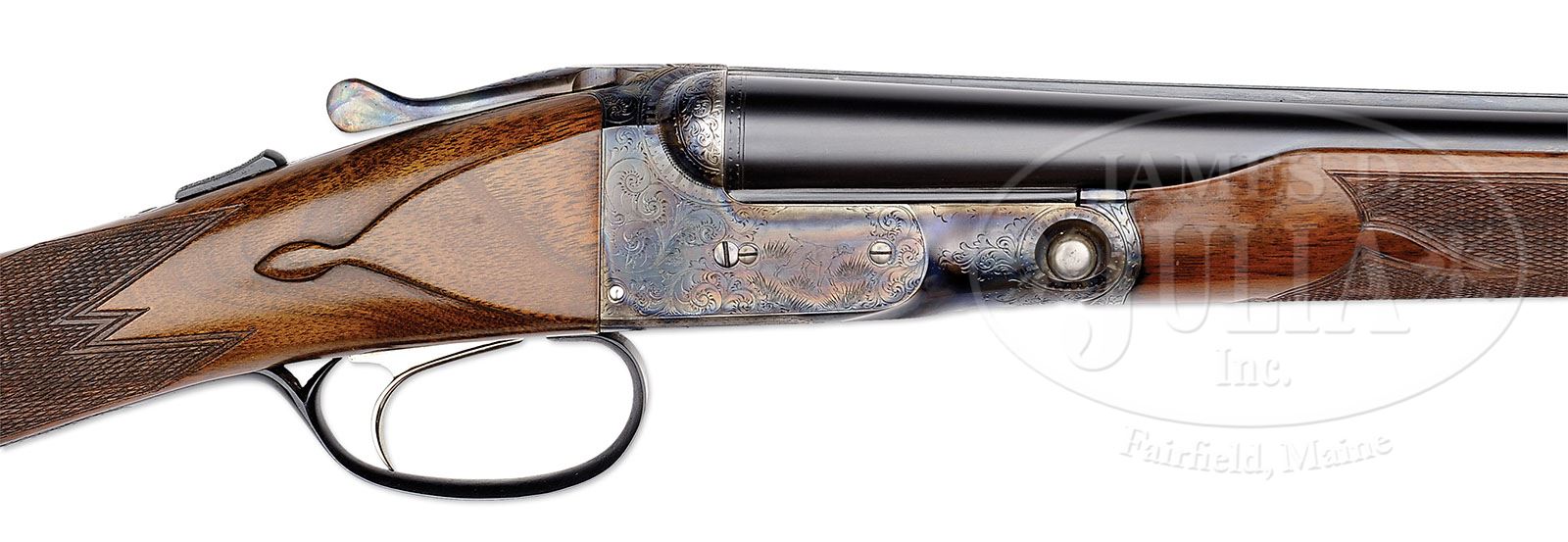 *28 GAUGE PARKER DHE SKEET GUN. SN 240141. Cal. 28 ga. 2-3/4″ Chambers. 00 Frame. 26″ Bbls are marked with Parker name and address and “Titanic Steel” on matted rib, fitted with two ivory beads. Bbl flats with Parker proofs, are stamped “SKEET IN SKEET OUT”. Typical DH action is fitted with automatic safety and Parker single selective trigger, has correct markings on water table, and typical “D” late style engraving with “Parker” on bottom of action. Nicely stump figured American walnut straight grip buttstock measures 14-1/2″ over checkered wood butt, and features typical “DH” checkering, drop points, and a silver oval on toe line engraved “L. A. M.” Matching ejector beavertail forend has reinforcing bolt. Parker Gun Identification and Serialization ledger lists this gun as grade “D” with single trigger, ejectors, and capped pistol grip stock. Bore diameter: left-.550, right -.552. Bore restrictions: left -.007 (Skeet), right -.008 (Skeet). Wall thickness: left -.027, right -.024. Drop at heel: 2-1/4″, drop at comb: 1-7/16″. Weight: 6 lbs. 4 oz. LOP: 14-1/2″. CONDITION: Excellent, as completely refinished. Bbls retain nearly all of a fine satin rust blue. Correctly colored rehardening is at nearly 100%. Stocks have only a few minor rubs and marks in their fine satin finish. Bores are excellent. Action is tight. Ejectors are in time. Trigger works. 4-49289 MGM112 (20,000-30,000)