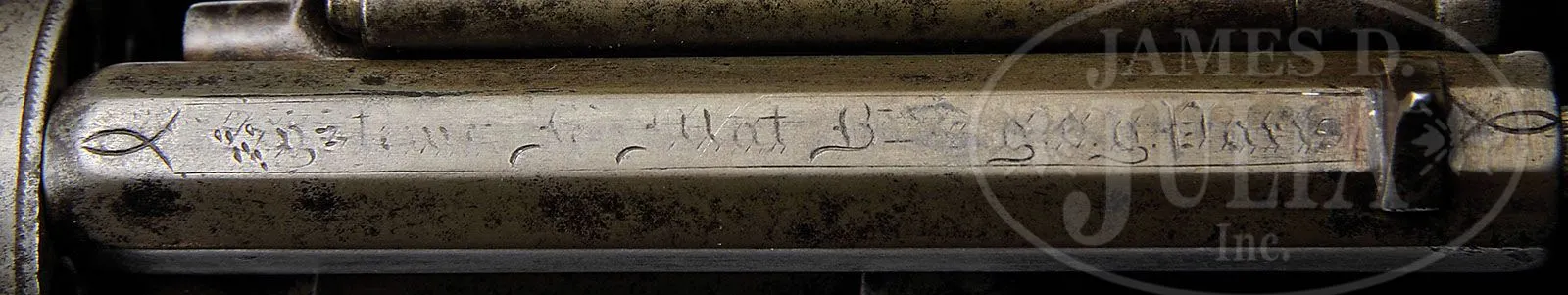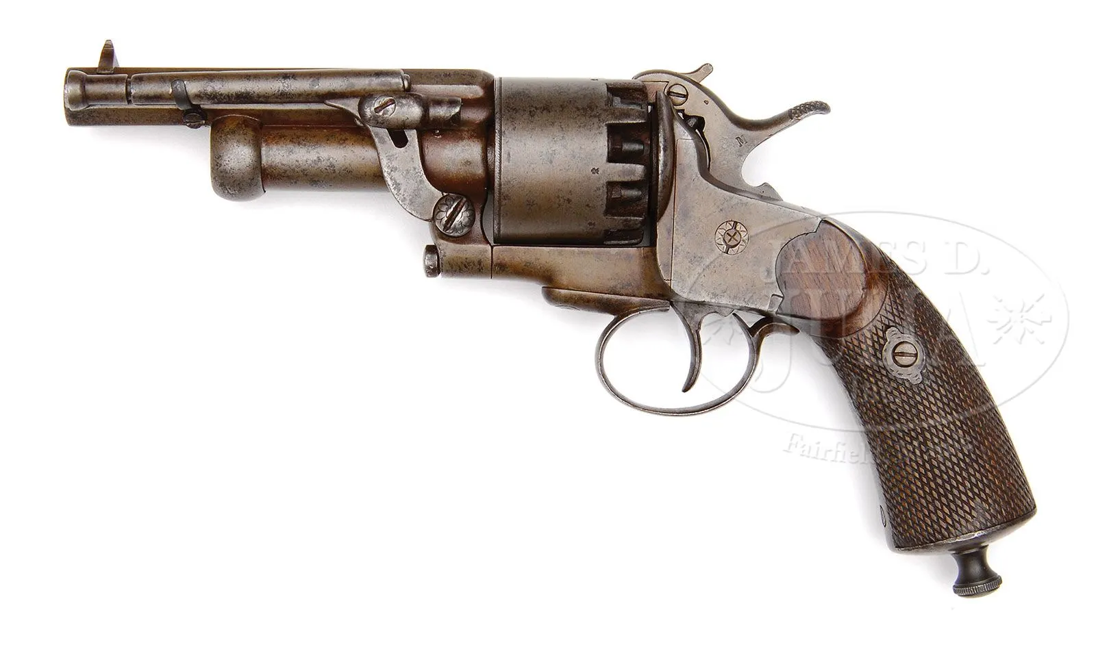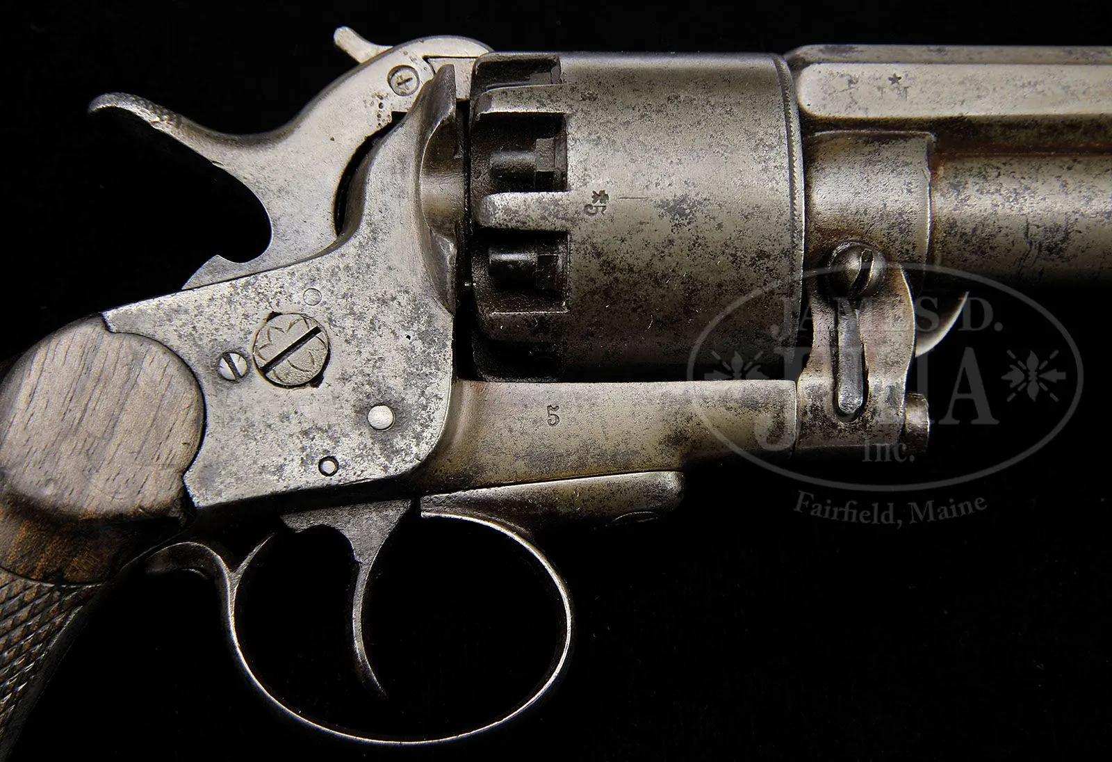EXTREMELY RARE CONFEDERATE BABY LEMAT PERCUSSION REVOLVER, EARLIEST SN KNOWN. SN 5. Cal. 32/41. This is among the rarest and most desirable of all Confederate revolvers with only 14 specimens known. This gun is also the lowest SN known SN 5. This gun like other known models in this configuration has a 4-1/4″ oct bbl with the last style of Paris address markings, which read “Systeme Le Mat Bte s.g.d.g. Paris” SN 5 is found externally on bbl, frame, cylinder and loading arm. Gun was not disassembled to look for other markings. This gun also has the “M” cartouche stamped on top of cylinder rarely seen on Confederate LeMat’s and at one time thought to stand for Confederate Inspector Lt. William Murdaugh from early writings of Ed Simmons and William Albaugh. Baby LeMat’s configuration can simply be described as a scaled down version of the orig LeMat, with 9 shot 32 cal cylinder and a rifled 41 cal secondary bbl in place of the 18 ga. shotgun bbl. These guns have the earlier style reciprocating pin system to rotate and lock cylinder seen in standard models that were used early in the Civil War. This gun appears orig and complete throughout with an apparent contemporary replacement of frame to bbl locking pin, which was not removed, and a repaired hammer screw and hammer nose, otherwise this very rare gun appears complete and orig and functions. CONDITION: Overall metal is gray with scattered areas of staining, rust and pitting. Bbl markings are mostly discernible though weak overall as can be seen in photographs. SN are easily discernible, except bbl marking which is weakly struck along with the “star/LM” adjacent to bbl SN. Rifling in both bbl bores is deep and discernible with pitting overall. An interesting note on this gun is the addition of British proofs on bbl and cylinder found only on the very late Paris models that were shipped to England in 1864. This is the only baby we know of with such proofs most likely meaning it sat in factory longer than other known guns that were shipped from Paris. As noted in description there is a welded repair to nose of hammer including the selector and selector screw. Hammer screw appears restored though the head may be orig. The screwed in tubular device in butt of stock, which Serpette in his book had some type of loading use, but we are not sure is possibly replaced in this gun as the color or pitting does not match balance of gun. 4-48236 JS26 (40,000-60,000)