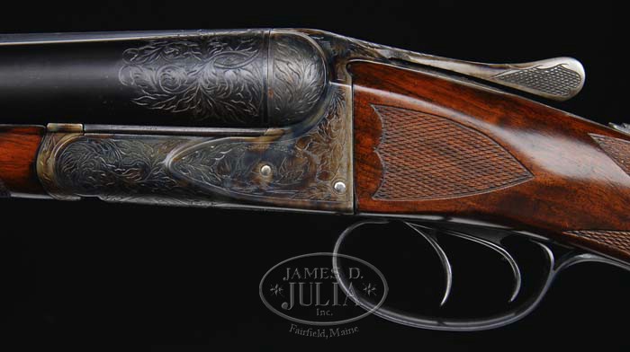 *OUTSTANDING RESTORED A. H. FOX XE GRADE SIDE-BY-SIDE SHOTGUN. SN 30010. Cal. 12 ga. 30″ Chromox Fluid Steel bbls with tapered, matted, concave rib with dual ivory sighting beads, 2-3/4″ chambers, FULL / FULL chokes, dbl triggers & ejectors. Chamber areas have 1-1/2″ wedge of leaf-and-vine engraving. Right bbl marked “CHROMOX FLUID COMPRESSED STEEL” & left “Made By A. H. Fox Gun Co. Phila. PA. U.S.A.”. Rebated X grade receiver engraved with leaf-and-vine pattern with shaded background, an oval with 2 flying ducks & “Ansley H. Fox” on left side & an oval with 2 flying quail and “Ansley H. Fox” on right side. Vignette on bottom is an oval with a fox looking up & hills in background. Remainder of action is leaf-and-vine with shaded background. Mounted with very colorful “streaky” walnut with checkered side panels, checkered rounded pistol grip & Hawkins pad. Checkered splinter forend with Schnable ebony insert tip. Bore diameter: left -.729, right -.728. Bore restrictions: left -.037, right -.037. Wall thickness: left -.032, right -.031. Drop at heel: 2-3/8″, drop at comb: 1-3/4″. Weight: 7 lbs. 13 oz. LOP 14-1/2″. PROVENANCE: The David Herrmann Collection. CONDITION: Extremely fine, as restored. This has an extremely high quality restored finish and could pass for orig. Blue & case colors are near 100%. Trigger guard with gold initials “E.D.” has near all of its finish. Stock is sound with 2 very minor hairline cracks behind top tang & slight chip on bottom left at rebate. There is a filled knot on top rear of comb & left side bottom toe line. Finish is a smooth hand-rub oil with fine fully-pointed checkering. Forend is solid with minor dark area around iron with hand-rubbed oil finish, fine checkering & Schnable ebony insert tip. Gun is tight, mechanics are crisp, with strong ejectors & shiny bores. 4-35246 BDT27 (8,000-12,000)