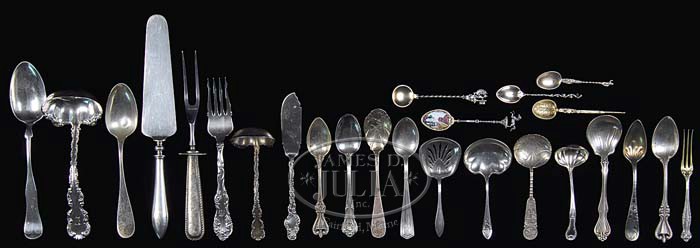 THIRTY-NINE PIECES OF STERLING FLATWARE. Mixed lot includes decorative small spoons, small serving pieces and two sets of teaspoons. Also included is a small lot of silver plated flatware. Weighable silver is 19 troy oz. CONDITION: Generally good, shows some use. 9-93618 (400-600)