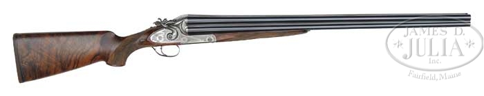 *FABULOUS ABBIATICO & SALVINELLI FOUR BARREL (QUATTRO CANNE) HAMMER/HAMMERLESS SINGLE TRIGGER GUN W/CASE. SN 266. Cal. 28 Ga. A fine example of this legendary gun. The original intention of producing this model was as a crowd pleaser for exhibition purposes. The gun garnered so much interest that in 1979 they produced a limited run of 15 of them, and a second run of 15 in 1983. 27-1/2″ Chopper lump barrels have narrow concave game rib with crossbolted doll’s head extension. Top left bbl is marked “Abbiatico & Salvinelli”. Bbl flats are stamped with Italian nitro proofs for 1979, “A & S”, and “Abbiatico Salvinelli”. Bottom of rear lump is stamped with “Dante Mario” and “Remo Tony”. Intricately sculpted action with tall standing breech and non-automatic safety (“S” inlaid in gold), has four locks. On initial examination it appears to be a very tall hammer gun with two back action rebounding locks. These locks have very nicely filed serpentine hammers which fire the top two bbls. Bottom 2 bbls are fired by Anson/ Deeley type internal hammers. Amazingly, all four bbls are fired by a single non-selective trigger which fires in the order of top right, top left, bottom right, bottom left. Action, lockplates, and hammers are engraved with about 60% coverage exceptionally well cut fine shaded scroll, with rose bouquet highlights. Both sides of action bar are inlaid in gold with “Abbiatico & Salvinelli”. Area under top lever is inlaid in gold with “3/15”, indicating that this is no. 3 of a run of 15 guns. Matching scroll engraved trigger guard has SN inlaid in gold on tang. A & S house engravers, “Bruno & Marco” signatures are on trigger plate. Trigger itself is decoratively filed. Finely marbled and slightly figured stump European walnut pistol grip buttstock measures 14-3/8″ over brown pad, and features drop points as well as 32 LPI checkering with line border. Matching splinter forend has Anson release. “A & S” gold shield device is inletted into open central diamond in forend checkering pattern. Bore diameter: Top left -.560, Top right -.560. Bottom left -.560, bottom right -.561. Bore restrictions: Top left -.014, Top right -.000. bottom left -.024, bottom right -.019. Minimum wall thickness: Top left -.026, Top right -.017. bottom left -.010, bottom right -.011. Drop at heel: 1-3/4″, drop at comb: 1-1/2″. Weight: 8 lbs. 9.3 oz, LOP 14-3/8″. Brown leather case with stitched leather corners with red interior and tan leather label embossed “A & S” . Accessories include A & S marked round oil bottle, striker case, and four snap caps, along with 3 turnscrews, some cleaning brushes, and the key. CONDITION: Excellent. Bbls retain nearly all of their fine satin blue, with some freckling from cleaned oxidation on top of top left bbl. Action retains nearly all of its coin finish, but darkened slightly on an area on rear of right lockplate. Stocks retain nearly all of their original finish, with a few minor compressions and marks. Trigger functions fine. Gun shows slight evidence of being fired. Case is very fine with a number of marks and rubs on exterior leather. Interior cloth shows compressions and some soiling from contact with gun. Oil bottle, snap caps, and striker case show tarnishing, and discoloration. Turnscrews appear to be as new, as they are still wrapped in their paper packaging. This fine gun balances and handles amazingly well. 4-40694 MGM91 (37,500-57,500)